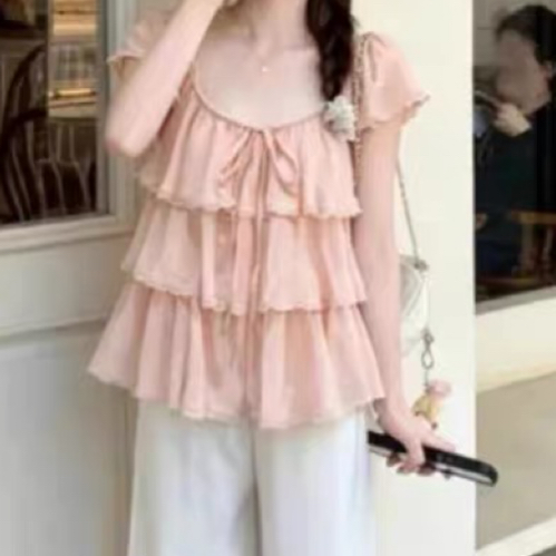 주문 재고 있음 프랑스식 프릴 V넥 반팔 셔츠 여름 새로운 한국 동대문 슈퍼 잘 생긴 쉬폰 톱