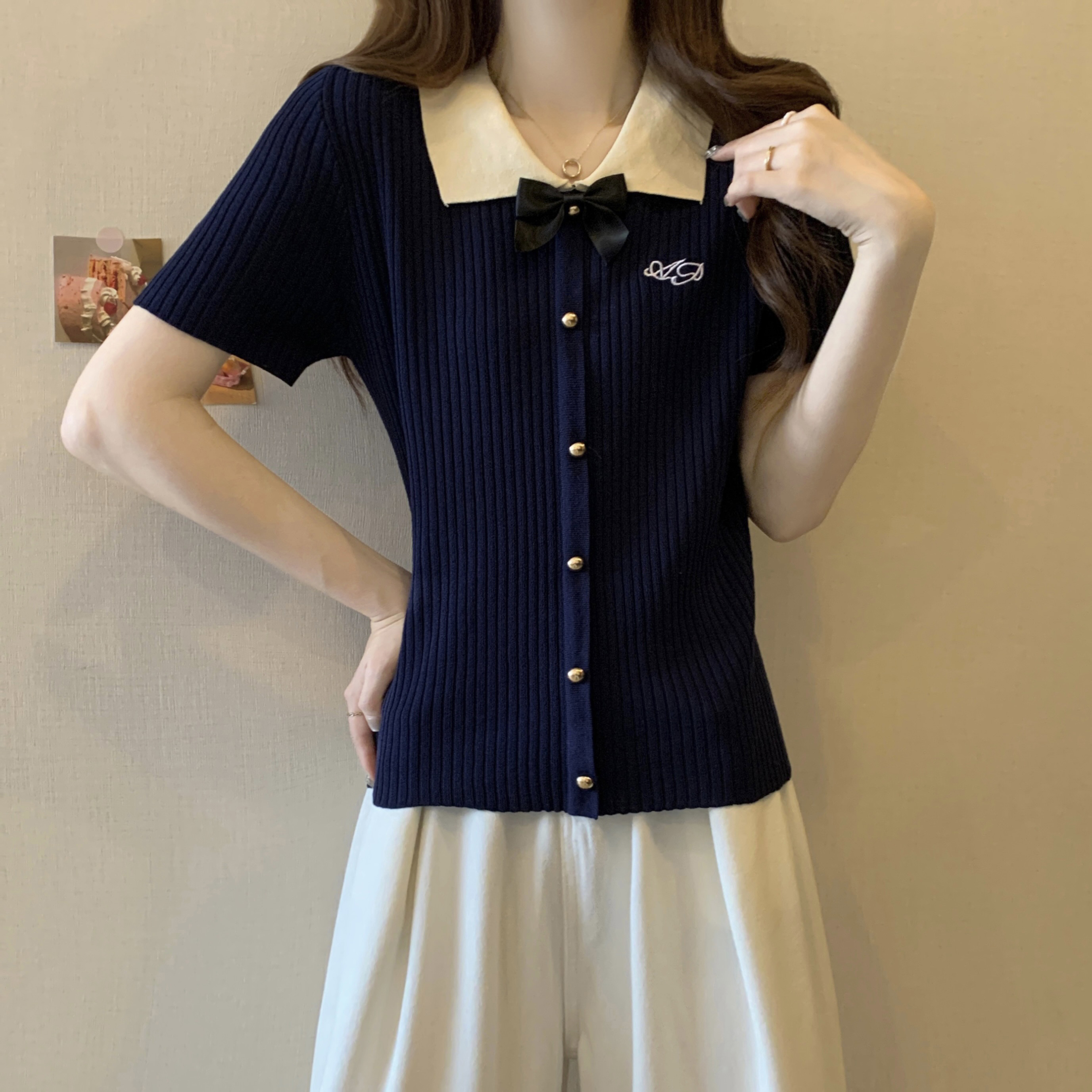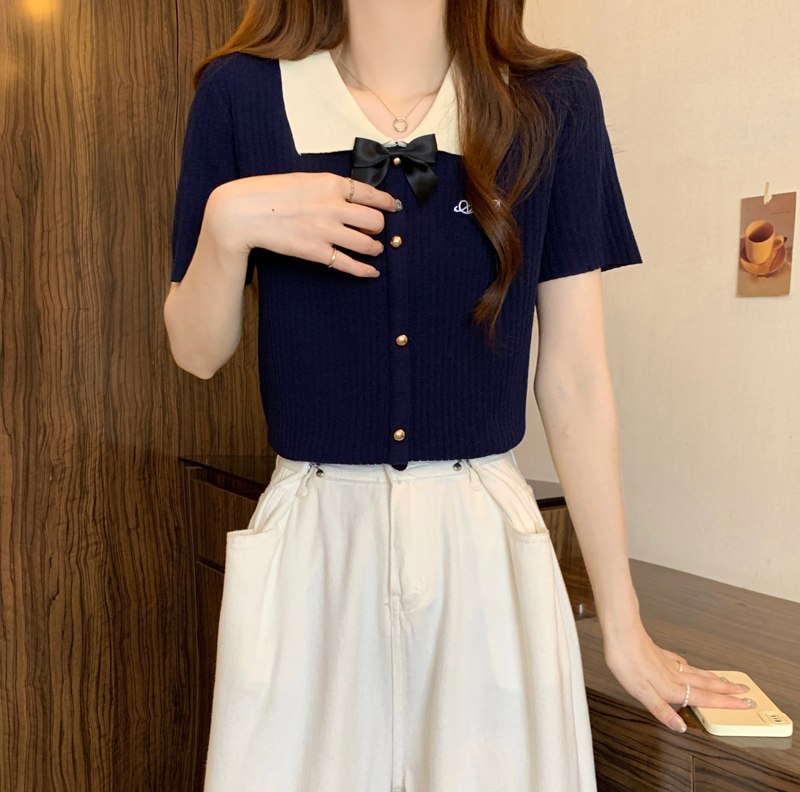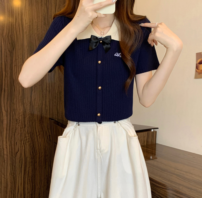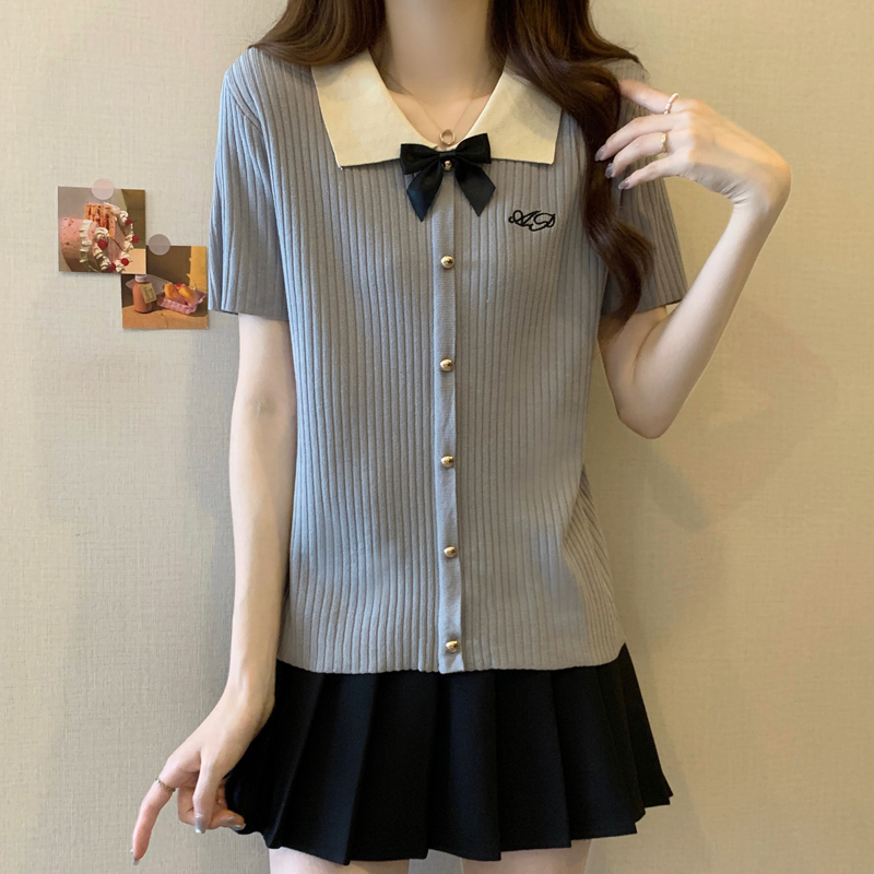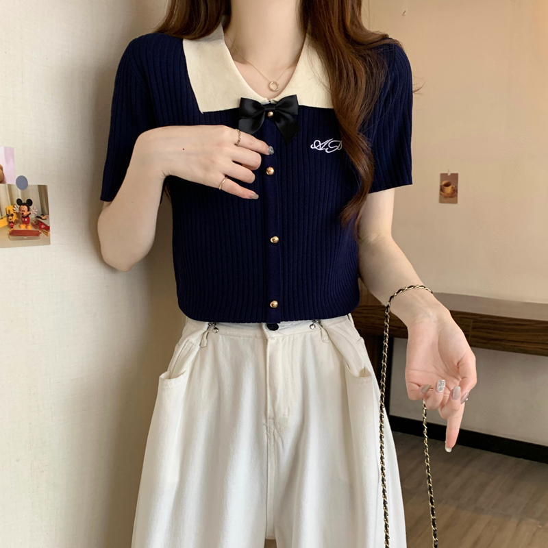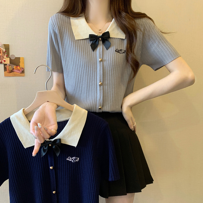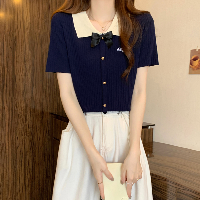 프랑스식 품격 POLO 칼라 화이트 니트 반팔 티셔츠 여성 여름 고급 센스 몸매 가꾸기 디스플레이 얇고 작은 맨위