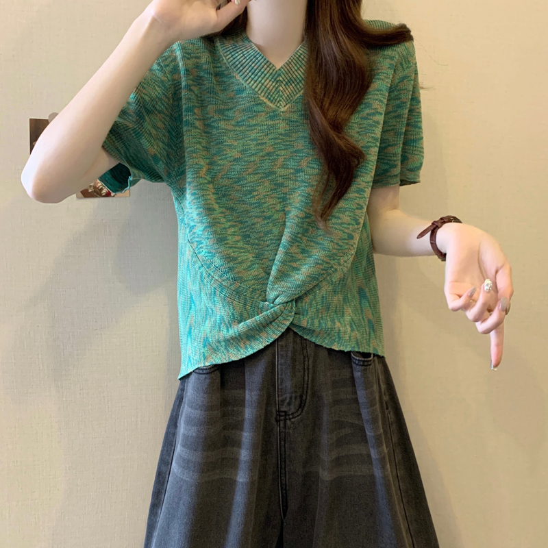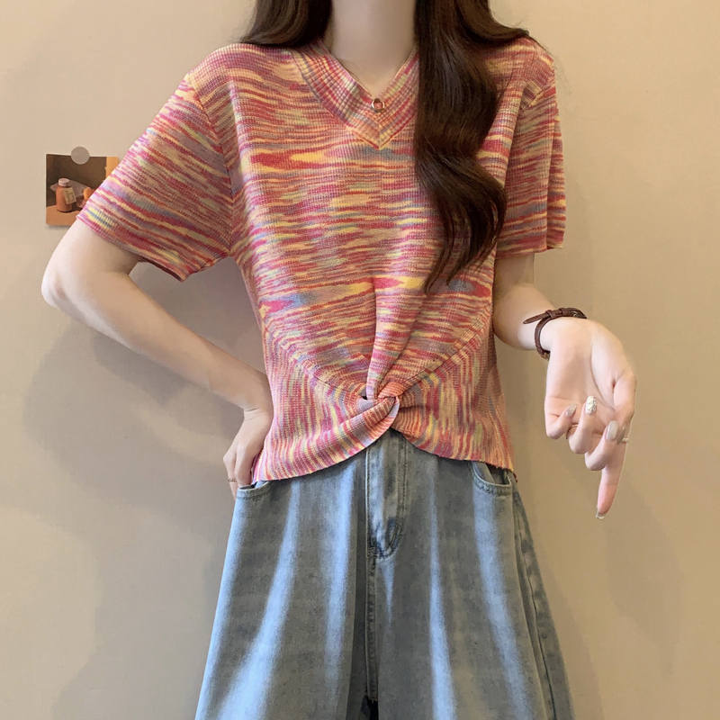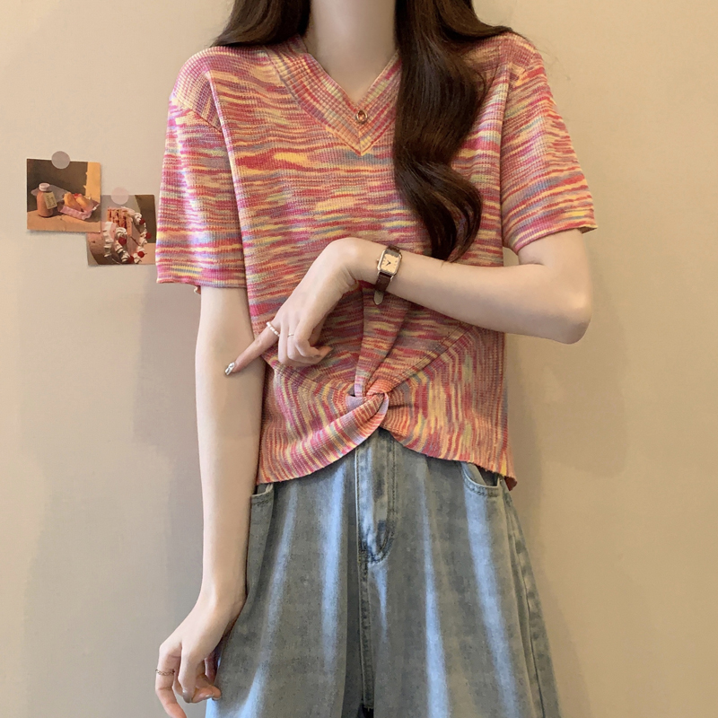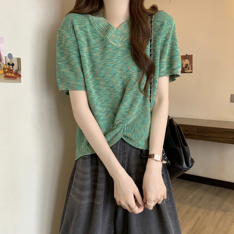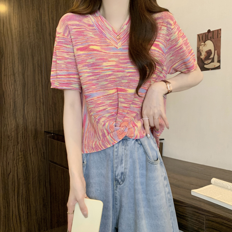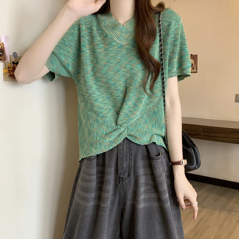 아메리칸 순수한 욕망 바람 V넥 반팔 티셔츠 여성 여름 몸매 가꾸기 달콤한 핫걸 긍정적 인 어깨 아름다운 다용도 맨위