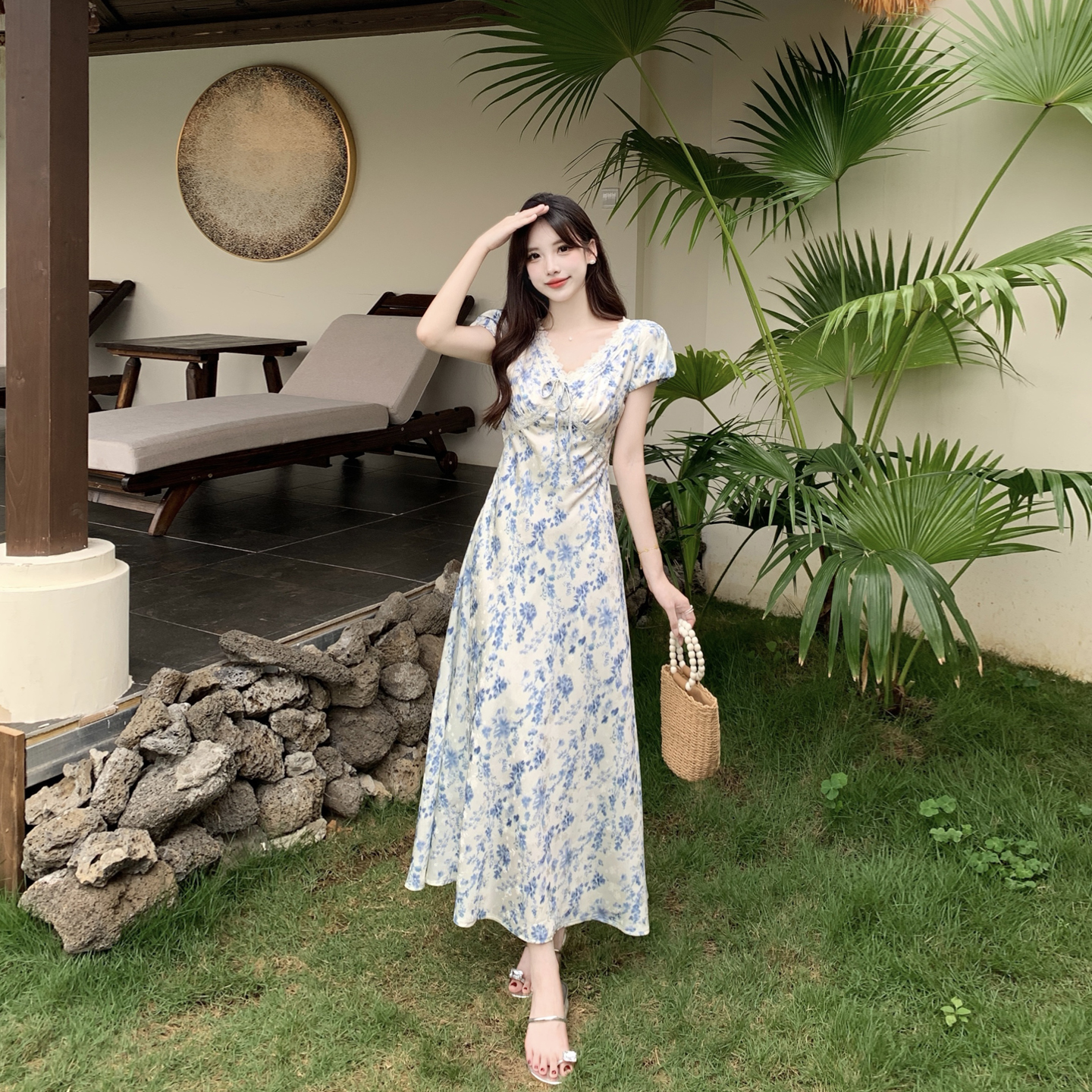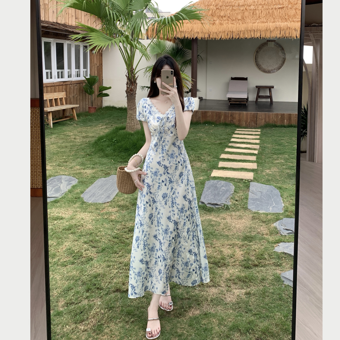 실사 빅 사이즈 여성 의류 프랑스식 부드러운 관대 한 점잖은 아름다운 파란색 꽃무늬 드레스 허리 수축 품격 휴가 치마