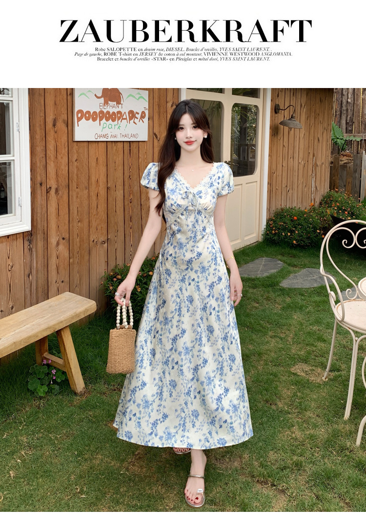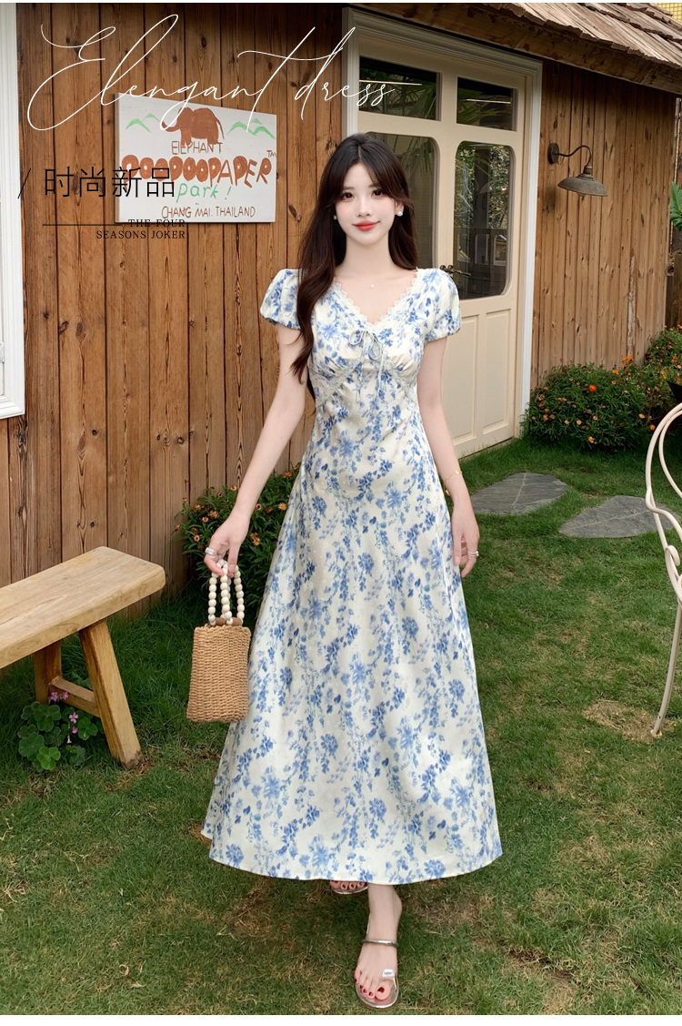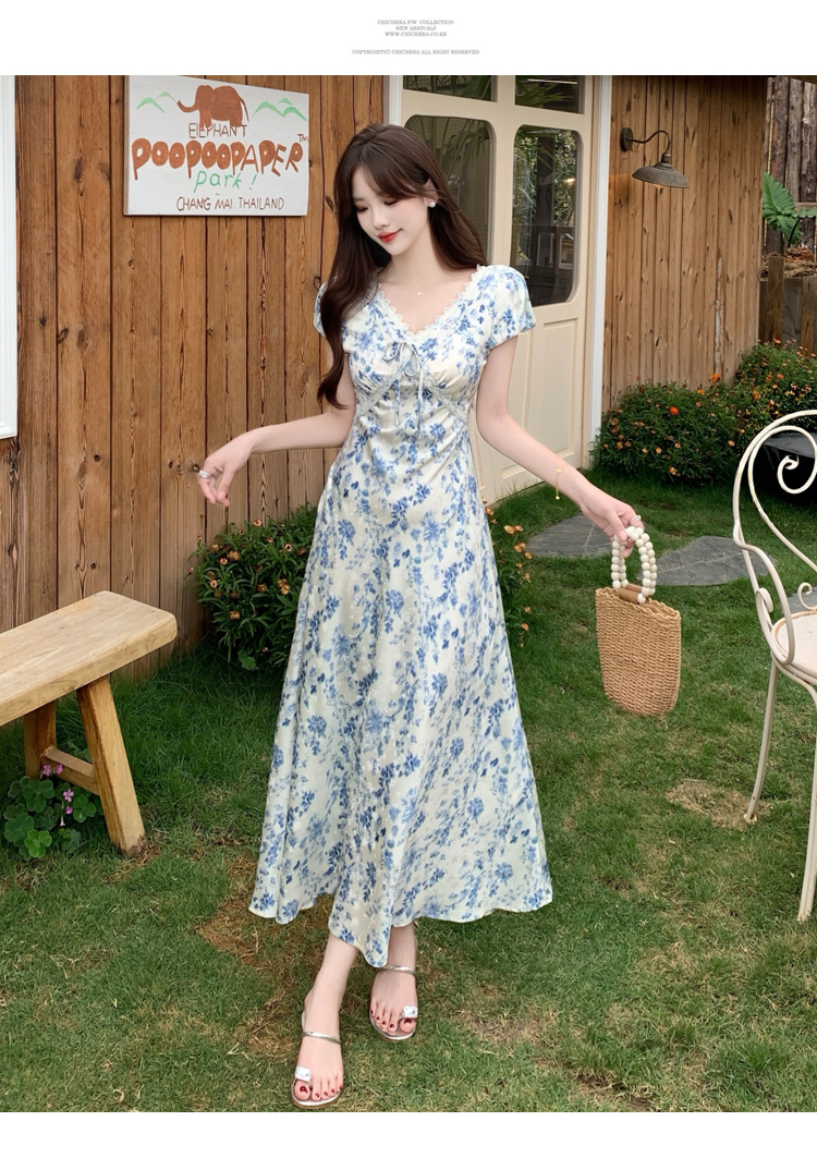 실사 빅 사이즈 여성 의류 이상적인 치마 프랑스식 낭만주의 꽃무늬 드레스 V넥 허리 수축 슬림해 보이는 휴가 바람 치마