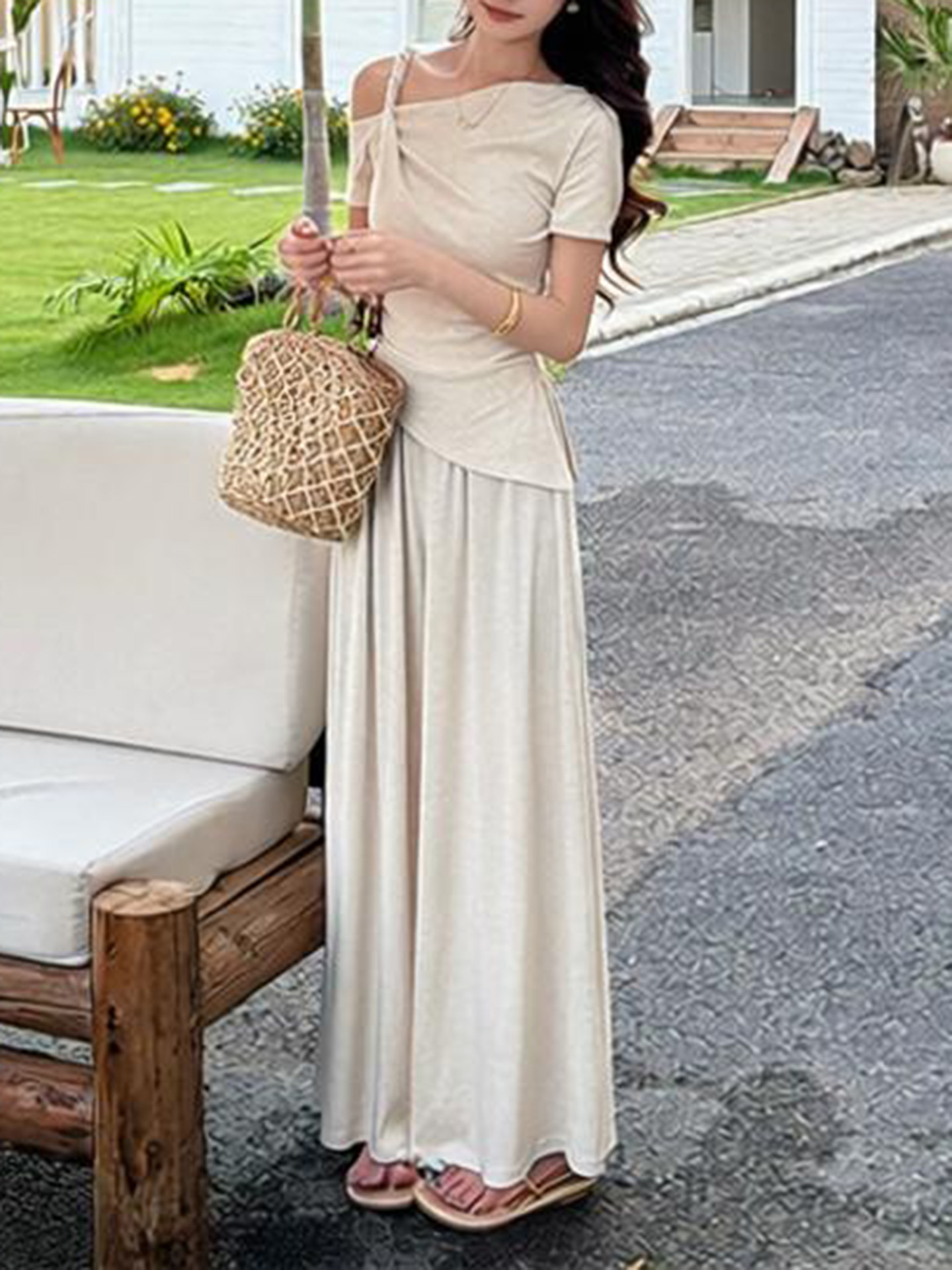 경관 그림 2026 여름 새로운 느긋한 세련된 슬림해 보이는 오프숄더 불규칙 밑단 맨위 와이드 레그 팬츠 투피스 세트