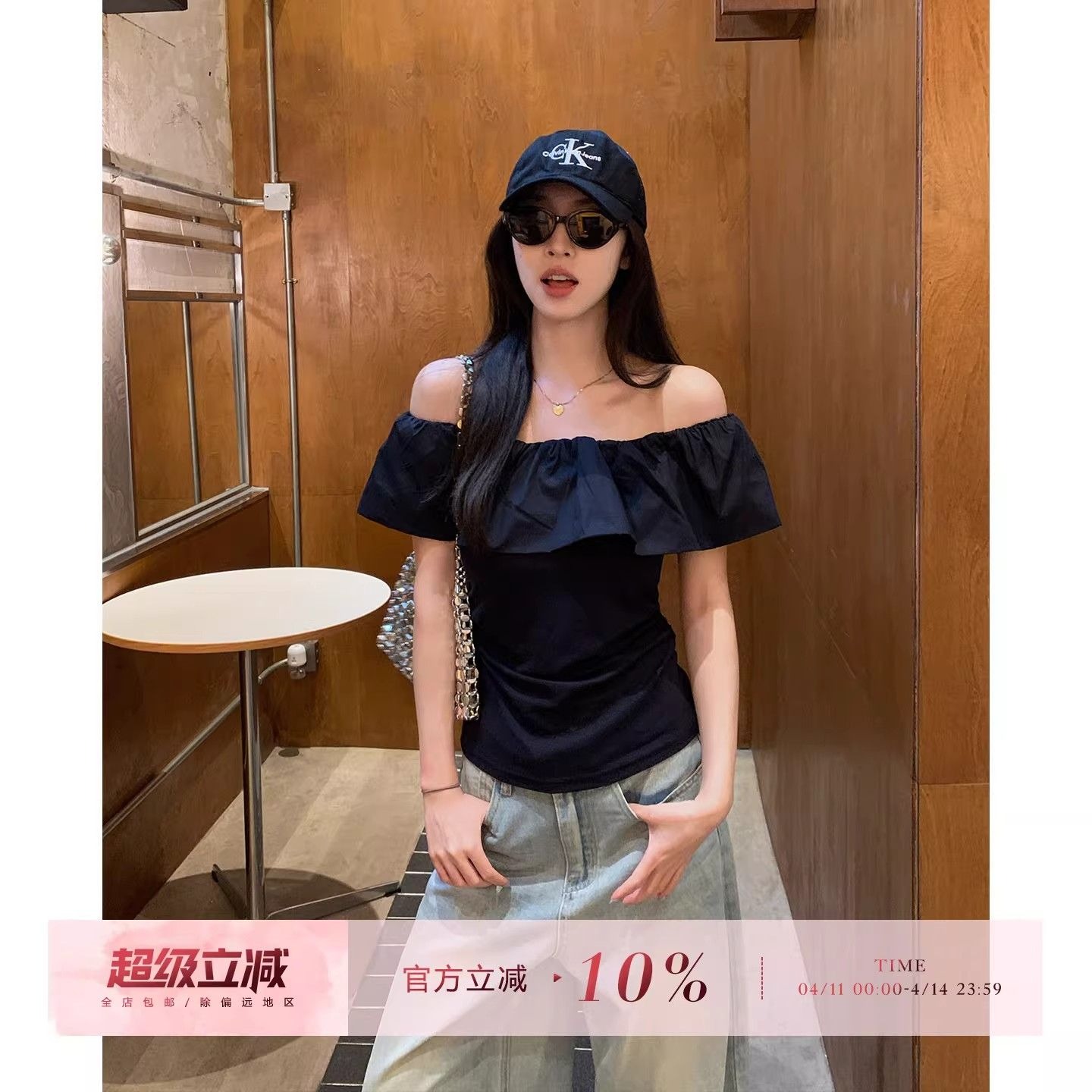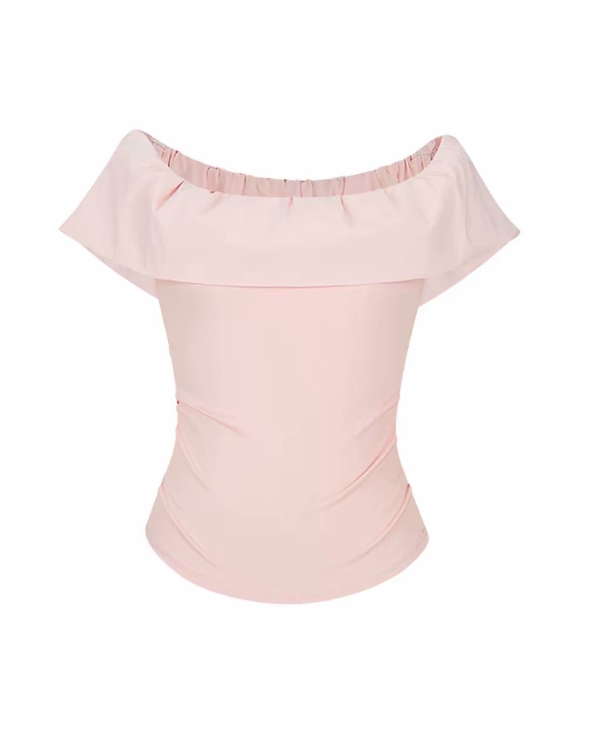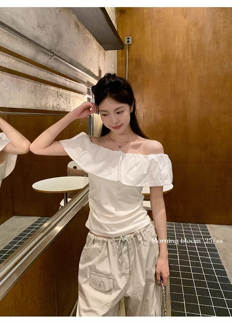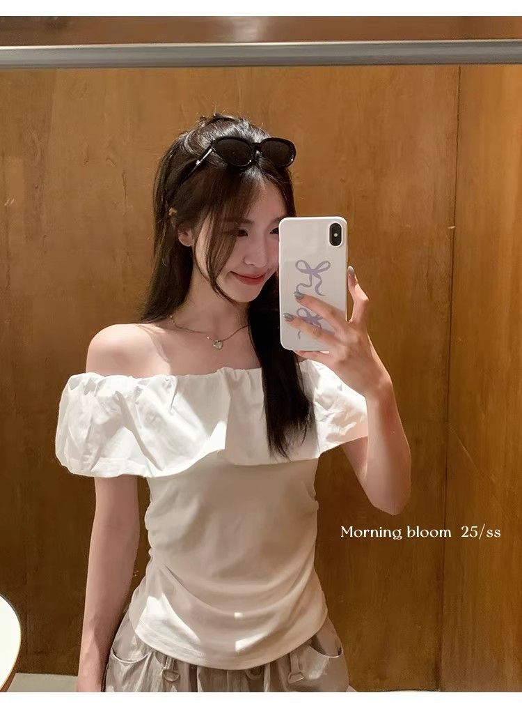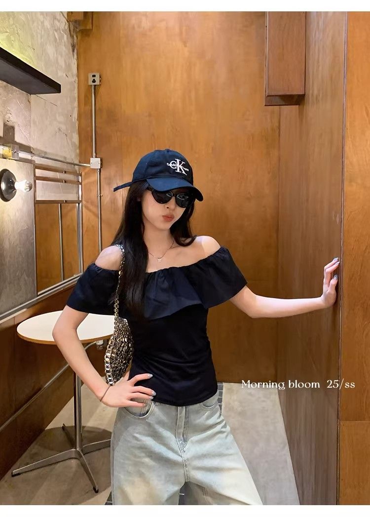 원본 것 2026 프랑스식 프릴 오프숄더 반팔 티셔츠 여성 여름 몸매 가꾸기 슬림해 보이는 오프숄더 맨위 트렌디