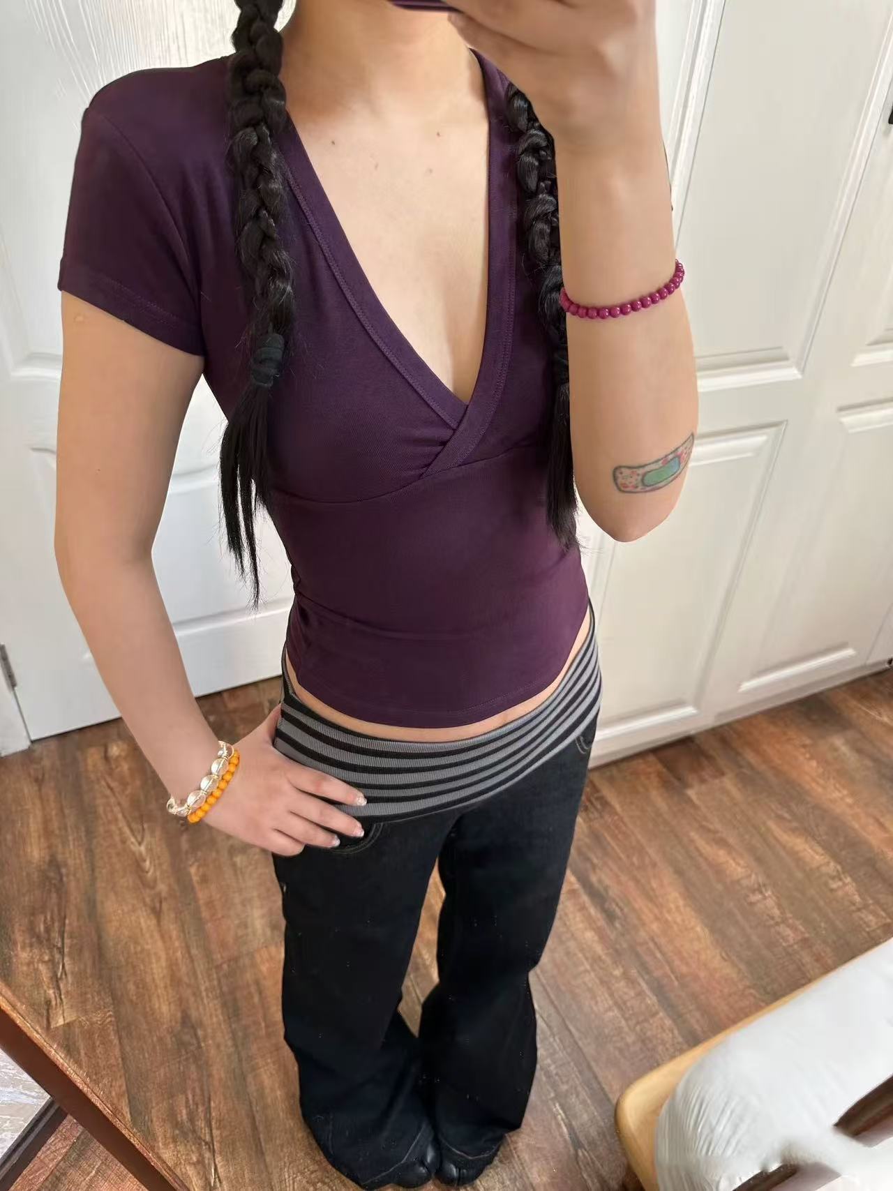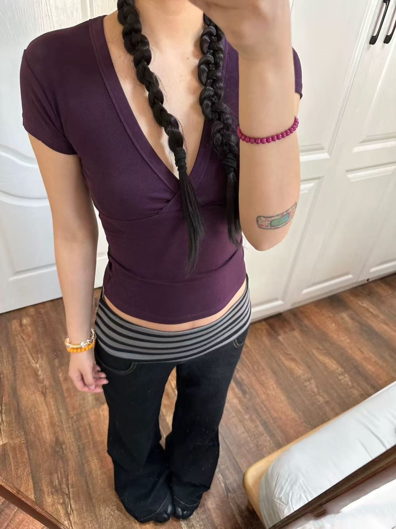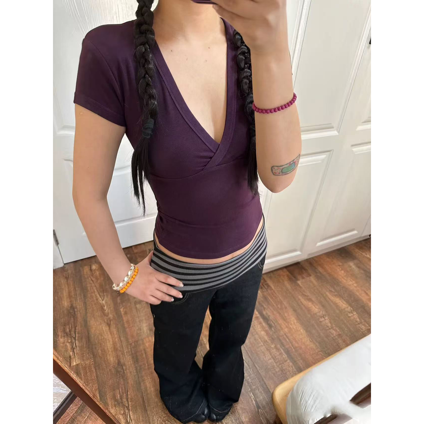 아메리칸 순수한 욕망 바람 V넥 반팔 티셔츠 여성 여름 몸매 가꾸기 달콤한 핫걸 긍정적 인 어깨 아름다운 다용도 맨위
