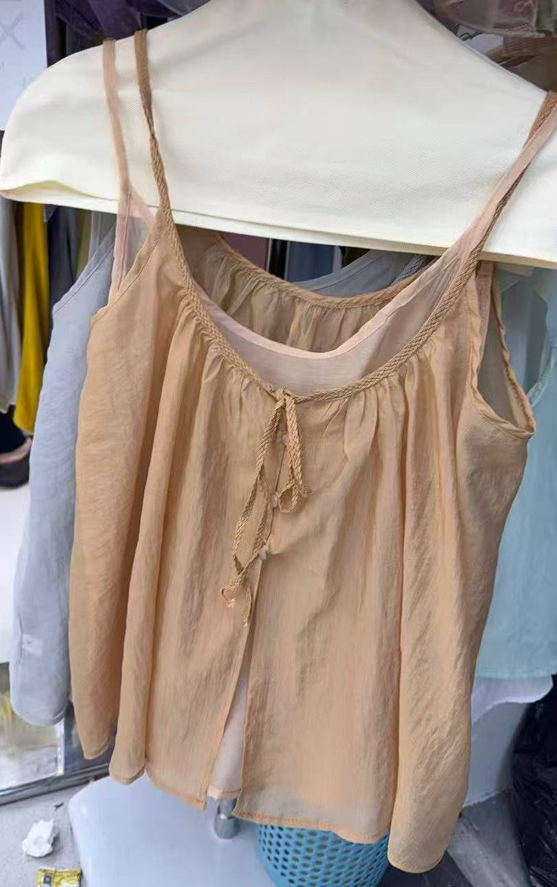 프랑스식 도트 무늬 리본 민소매 쉬폰 조끼 여성 여름 2026 새로운 루즈핏 디자인 센스 품격 맨위