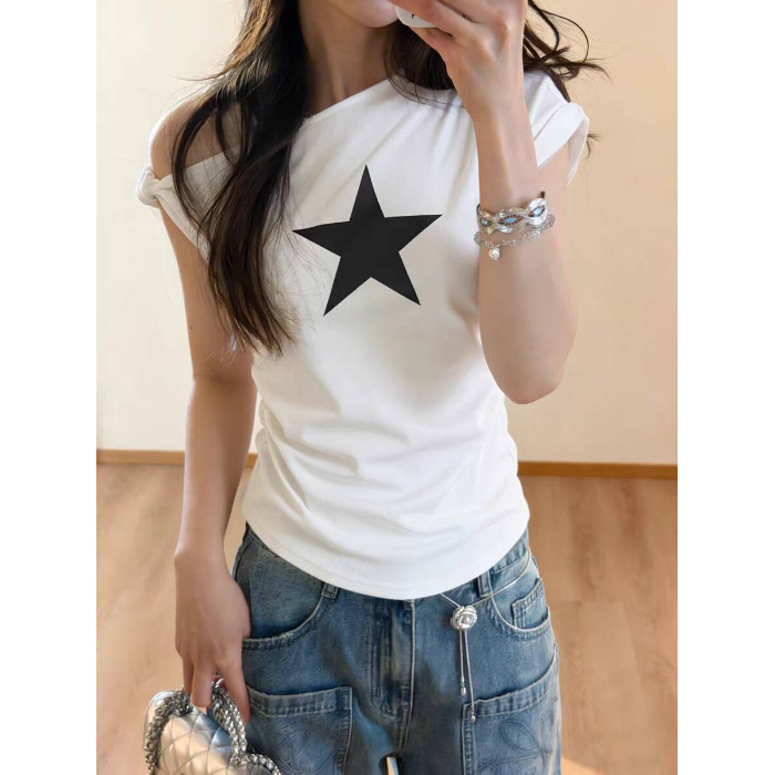 40 면 1 1 오스트리아 세대 서울 220 그램 아메리칸 핫걸 비스듬한 어깨 별 프린트 반팔 티셔츠 여성