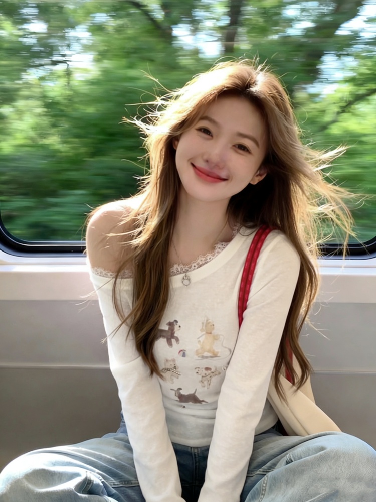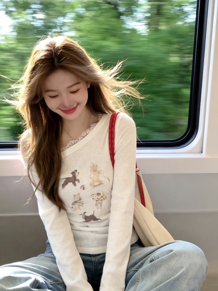 한 부서 연령 감소 강아지 프린트 레이스 조각 비스듬한 어깨 긴팔 티셔츠 여성 봄 몸매 가꾸기 오프숄더 맨위