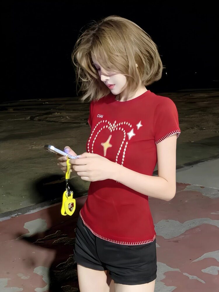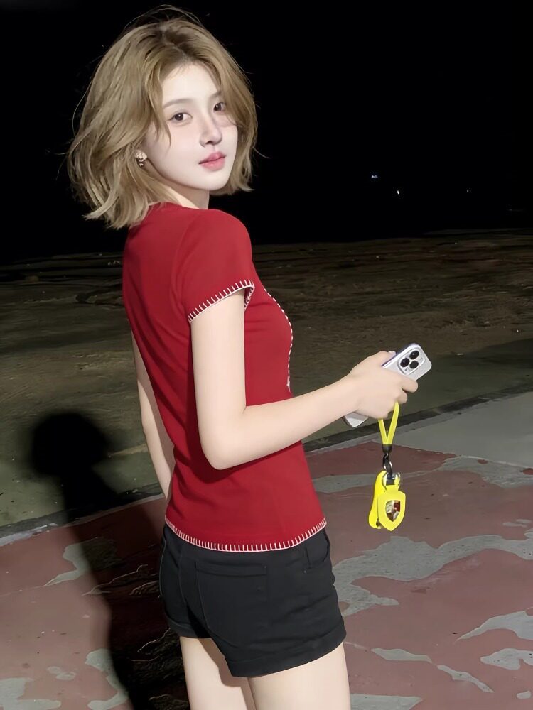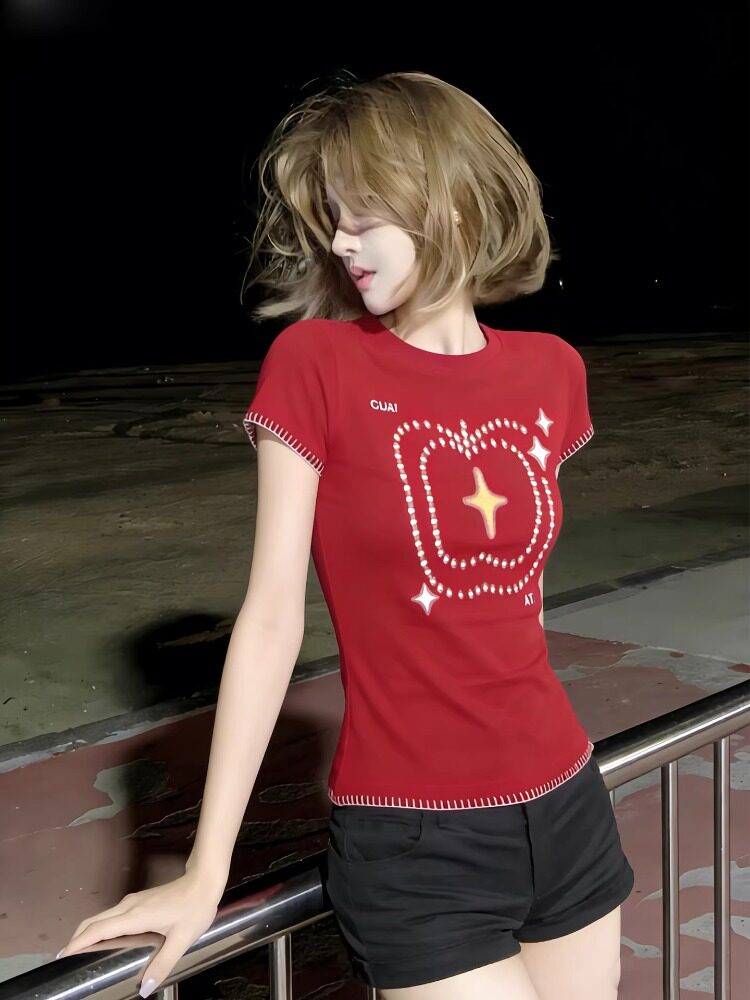아메리칸 핫걸 레트로 명시적 스티치 디자인 반팔 티셔츠 여성 작은 키 긍정적 인 어깨 몸매 가꾸기 라운드 넥 맨위
