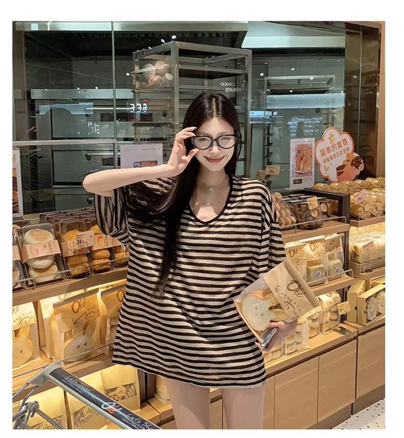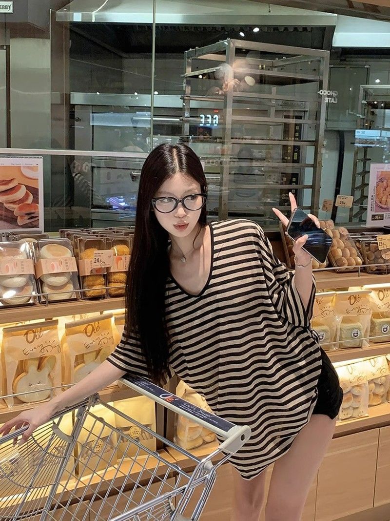 여름 디자인 센스 비스듬한 어깨 프린트 스트라이프 반팔 티셔츠 여성 여름 루즈핏 느긋한 바람 다용도 맨위