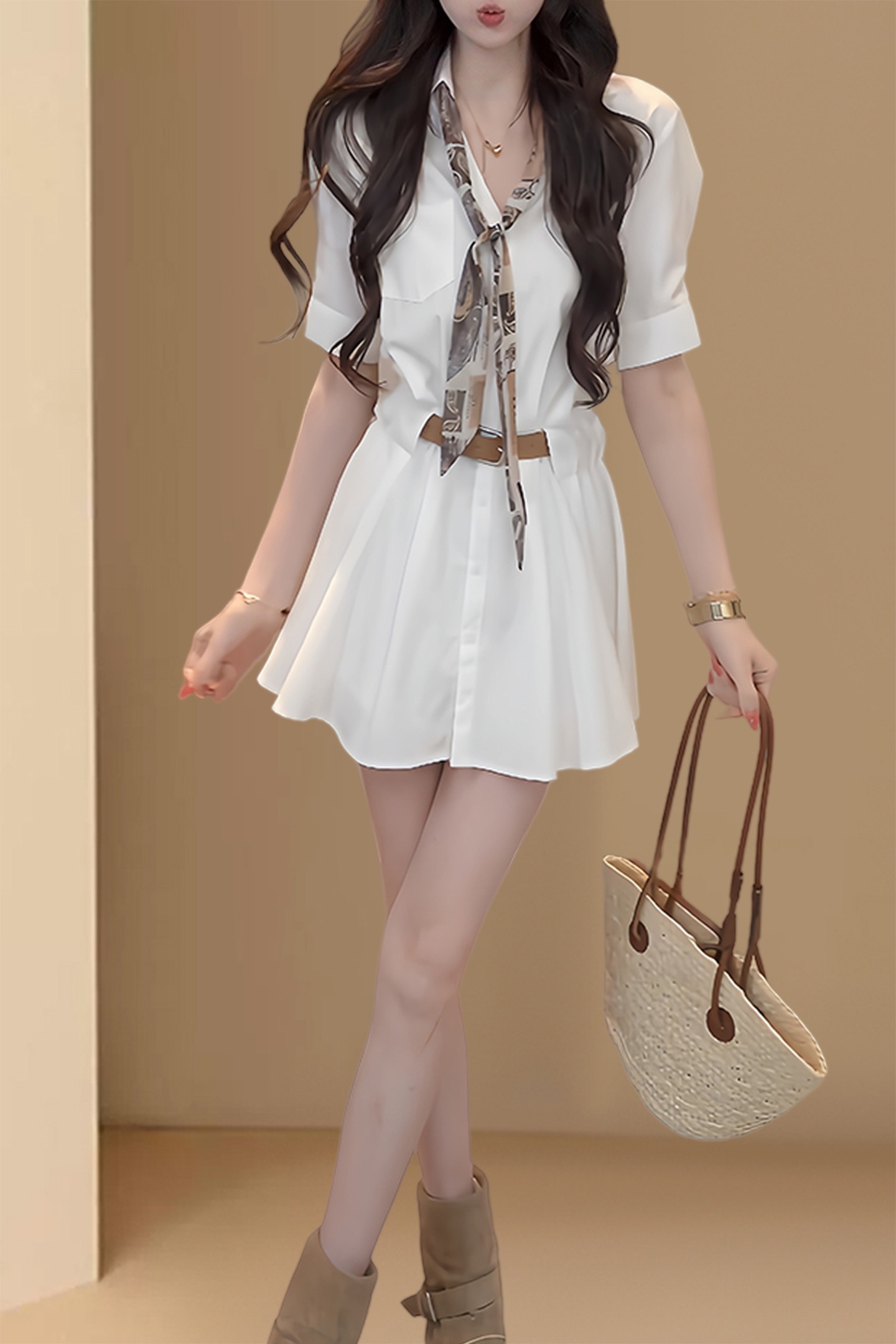 경관 그림 프랑스식 미니멀리즘 캐주얼 패션 V넥 미니 스커트 여름 허리 수축 슬림해 보이는 품격 작은 키 플리츠 셔츠 드레스