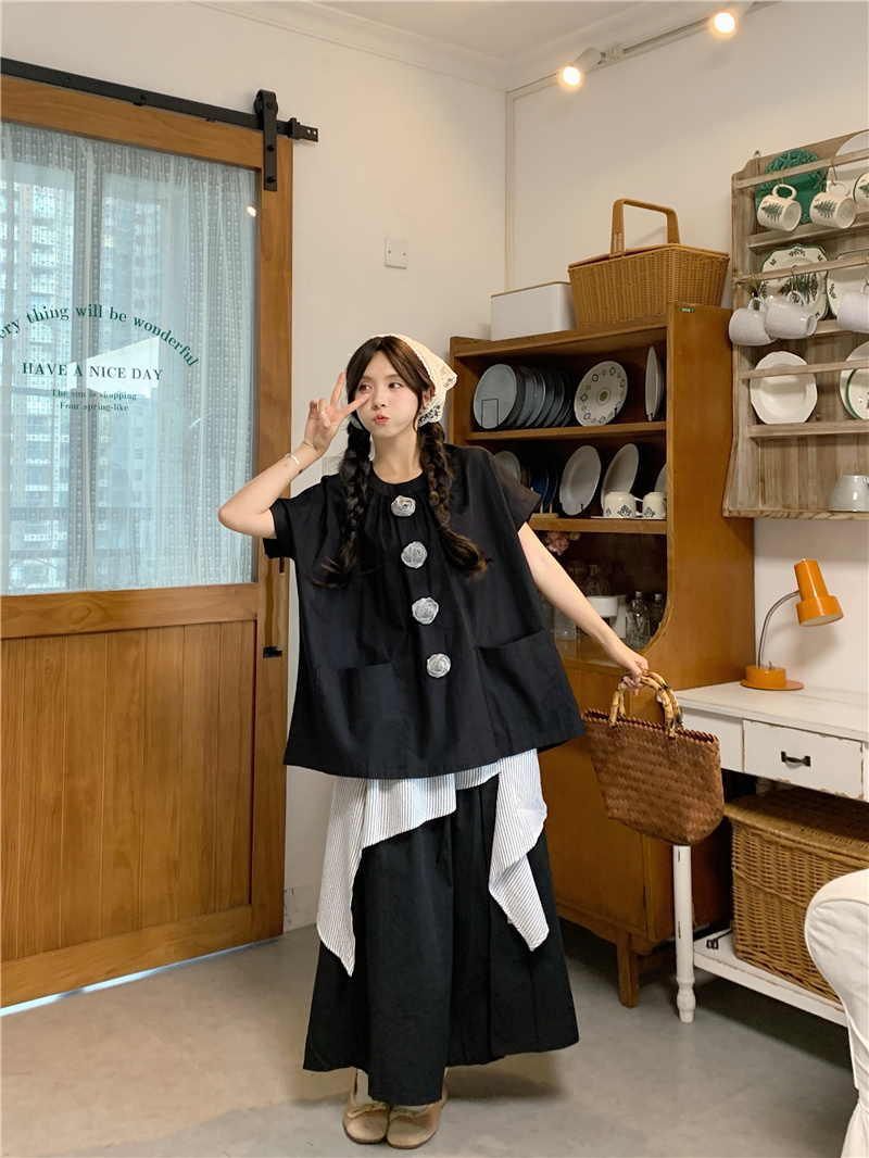 실사 일본식 귀여운 3 차원 장미 라운드 넥 반팔 불규칙 반신 스커트