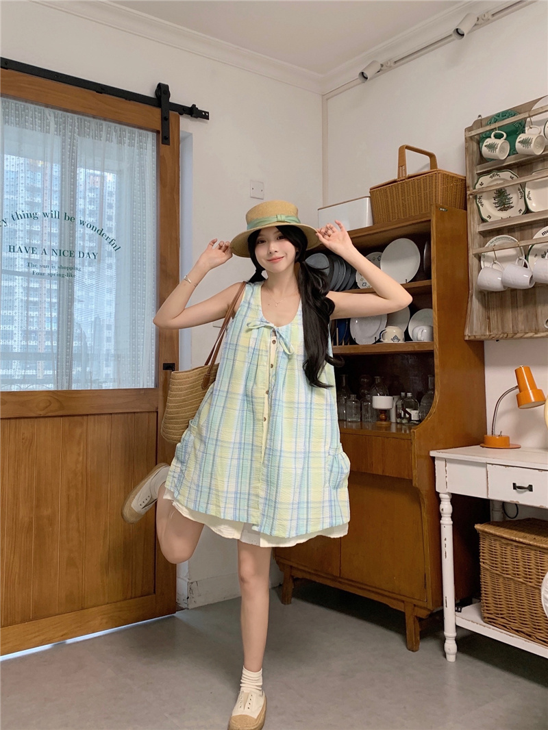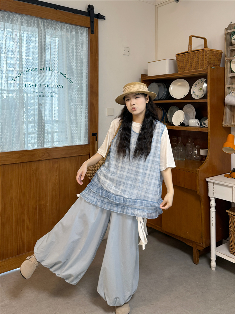 실사 다용도 루즈핏 슬림해 보이는 경 사진 밑단 트임 민소매 면 베스트 조끼 체크무늬 와이드 레그 팬츠