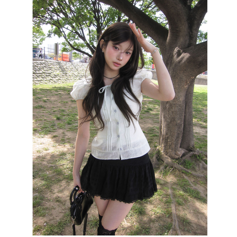 chic 한국 스타일 프릴 반팔 싱글 줄 버튼 페이크 레이어드 셔츠