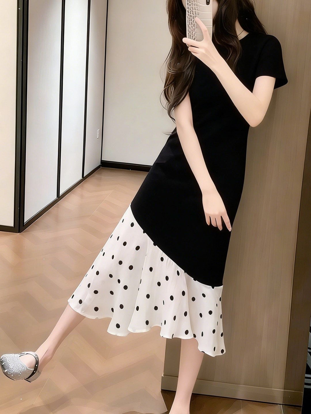 2026 검정색 티셔츠 패치워크 도트 무늬 여성 드레스 여름 한 부서 패션 품격 느슨함 센스 루즈핏 캐주얼 롱 스커트