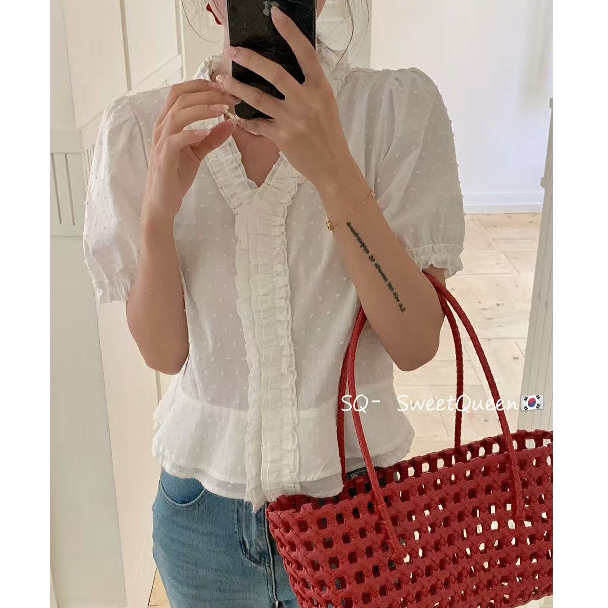 한국 스타일 화이트 레이스 홀로우 아웃 V넥 거품 소매 반팔 여성 셔츠 여름 작은 키 외국 가스 셔츠 맨위