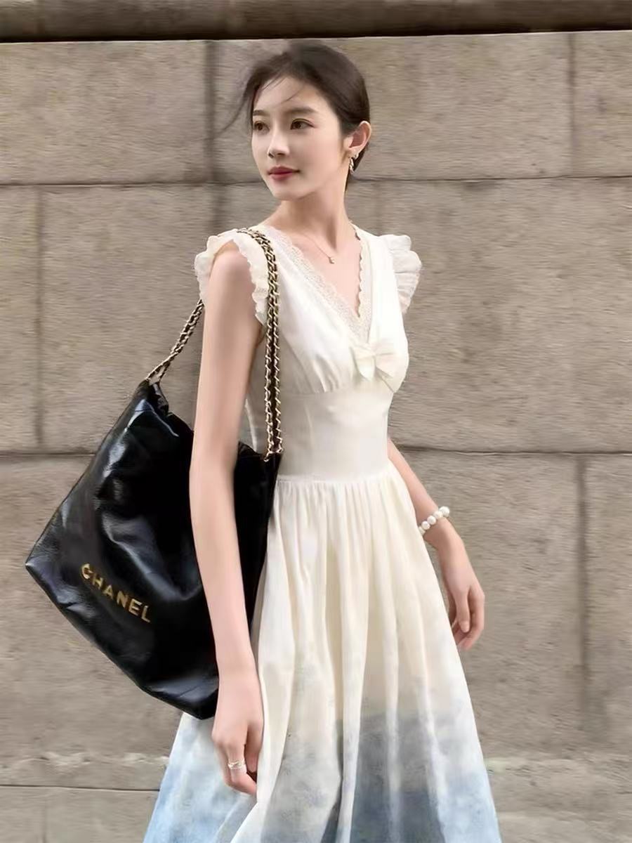2026 자이언트 잘 생긴 아름다운 아니요 명중 섹션 프랑스식 부드러운 휴가 화이트 나비 매듭 작은 날다 소매 여성 드레스 여름