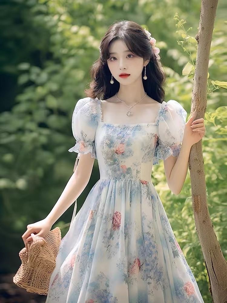 차 휴식 프랑스식 꽃무늬 거품 소매 슈퍼 요정 점프 슈트 치마 여름 드레스 여성 새로운 반팔 프린트 광장 칼라 요정 치마