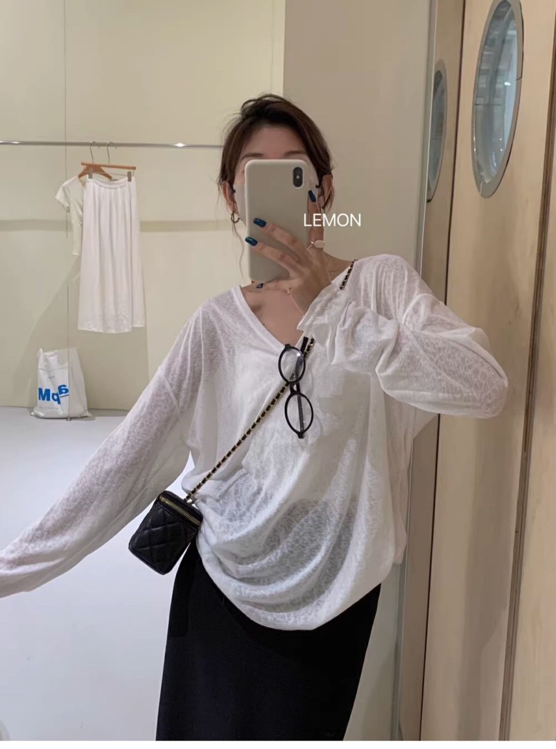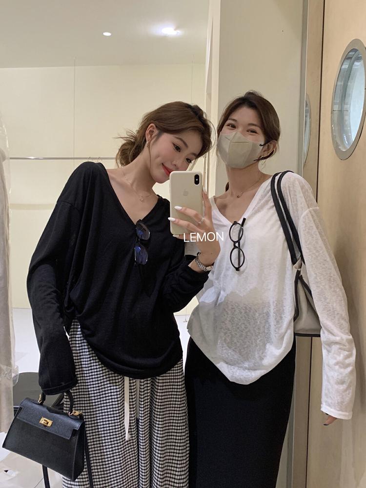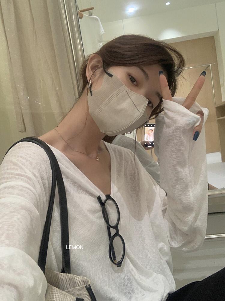 대나무 마디 리브 V넥 긴팔 자외선 차단 블라우스 외부 가져 가라. 셔츠 Tulle 맨위
