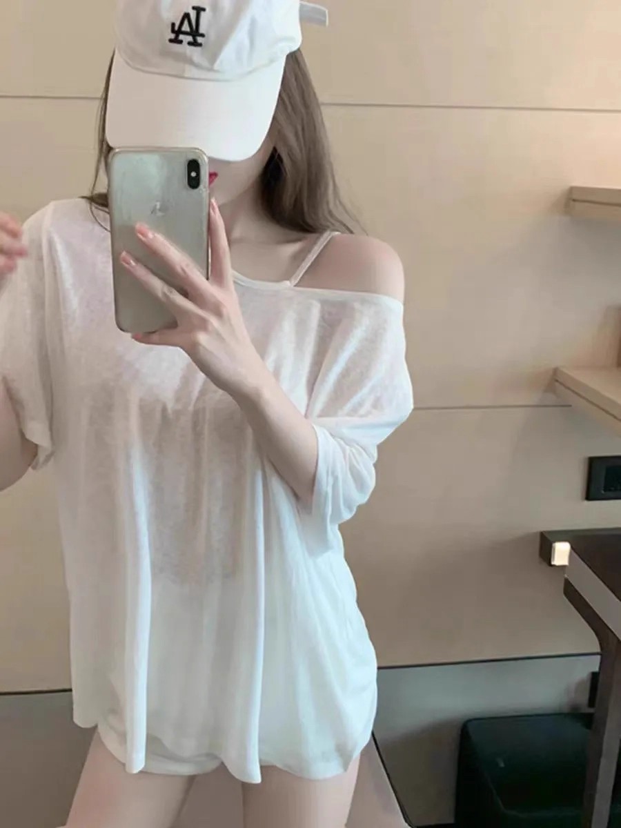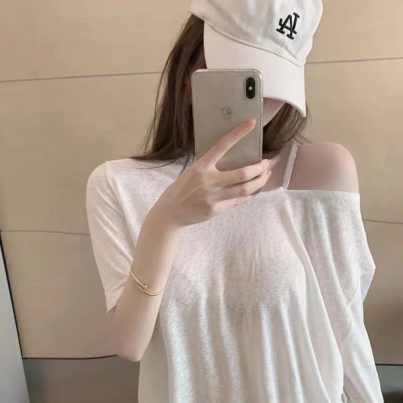 실사 빅 사이즈 아메리칸 레트로 핫걸 레이스 조각 비스듬한 어깨 반팔 티셔츠 여성 순수한 욕망 허리 수축 여름 작은 맨위