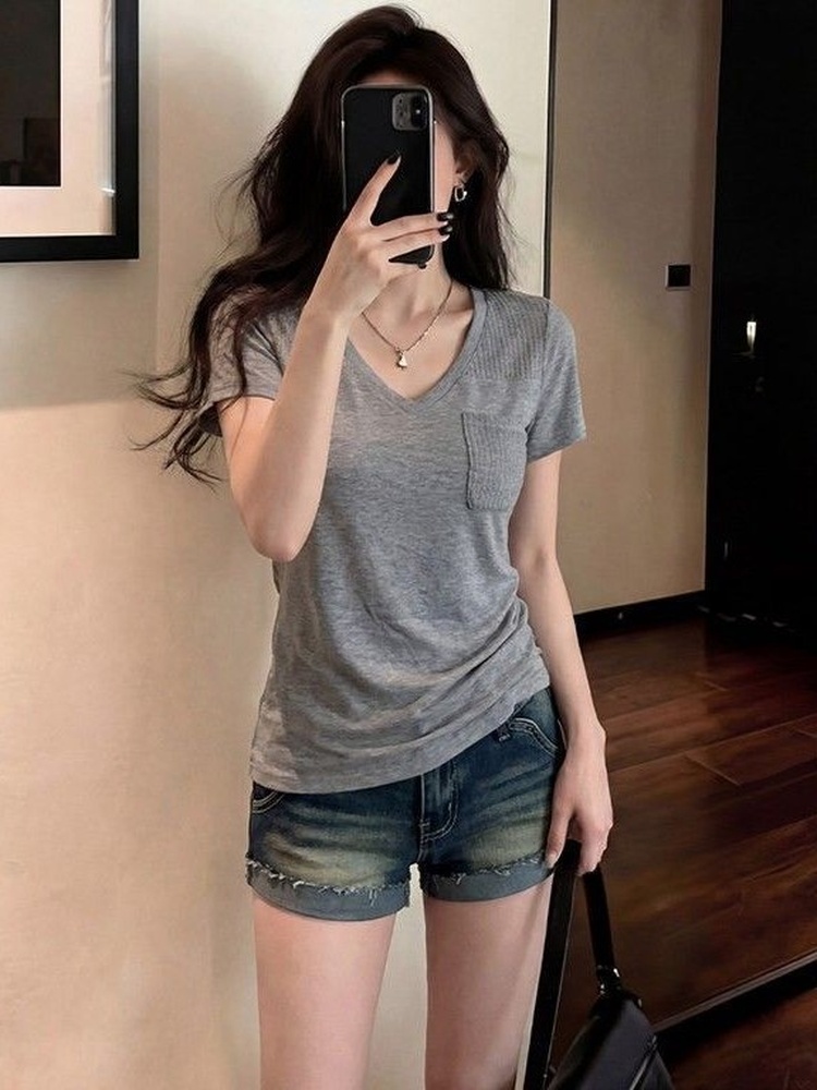 아메리칸 순수한 욕망 바람 V넥 반팔 티셔츠 여성 여름 몸매 가꾸기 달콤한 핫걸 긍정적 인 어깨 아름다운 다용도 맨위
