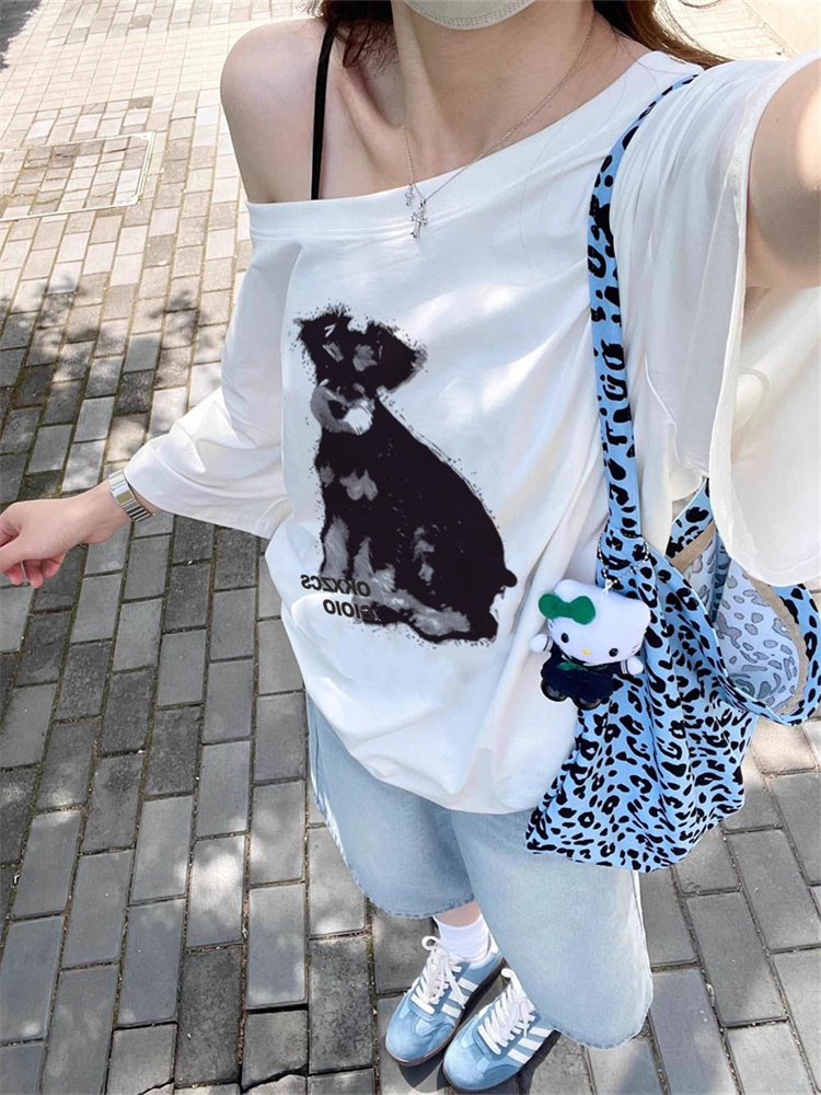 순면 아메리칸 핫걸 비스듬한 어깨 반팔 티셔츠 여성 강아지 프린트 루즈핏 캐주얼 오프숄더 맨위 여름