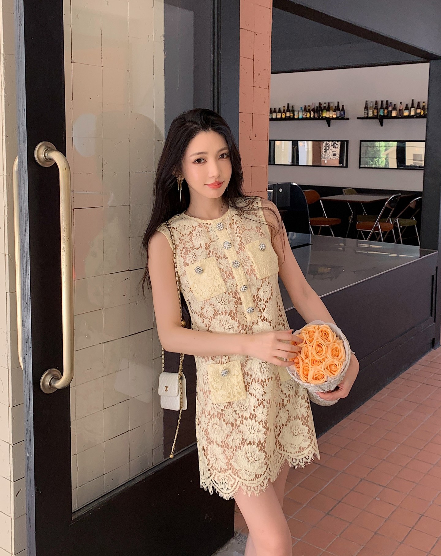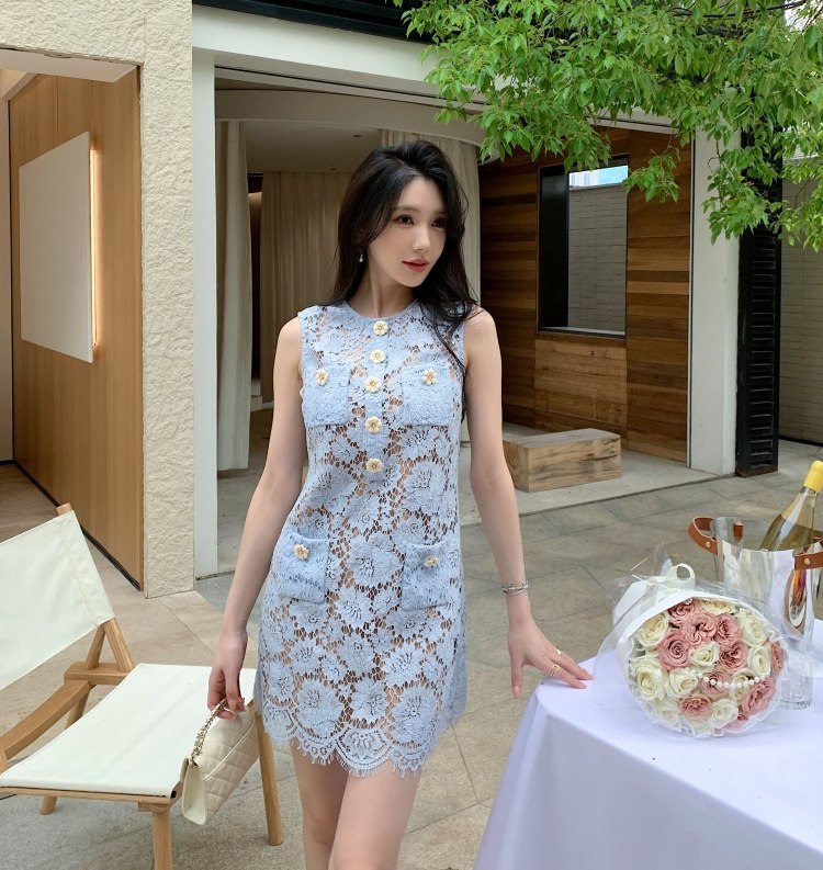 여름 새로운 여성 의류 프랑스식 작은 샤넬 스타일 파란색 레이스 꽃 민소매 쇼트 스타일 한 마디 드레스 새로운 도착 황색