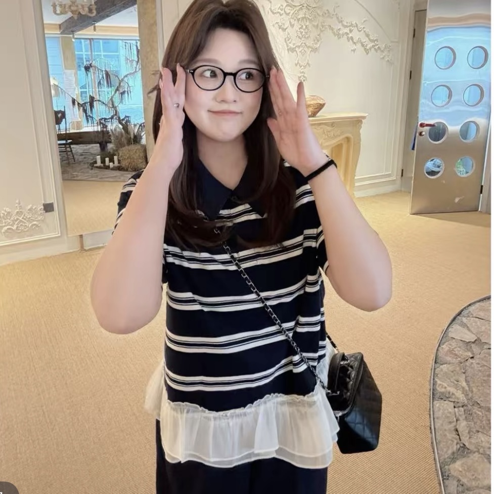 빅 사이즈 검정색 해군 칼라 반팔 티셔츠 여성 여름 새로운 지방 mm 표지 고기 슬림해 보이는 디자인 센스 배색 맨위