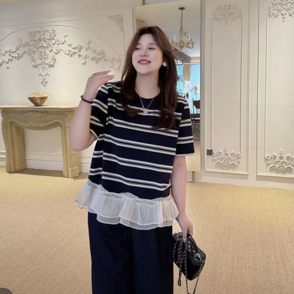 빅 사이즈 마이크로 지방 mm 프랑스식 도트 무늬 망사 반팔 티셔츠 여성 여름 새로운 몸매 가꾸기 슬림해 보이는 맨위