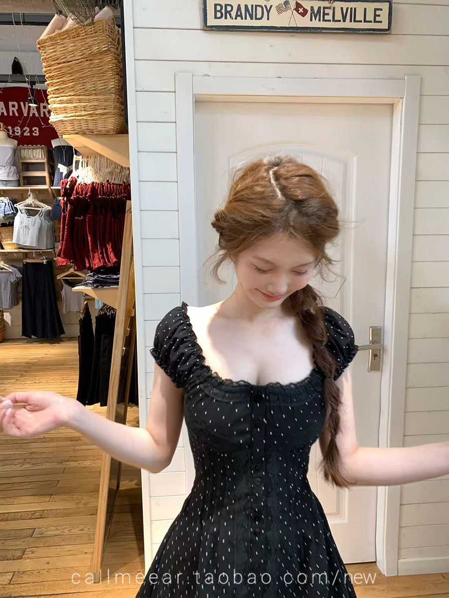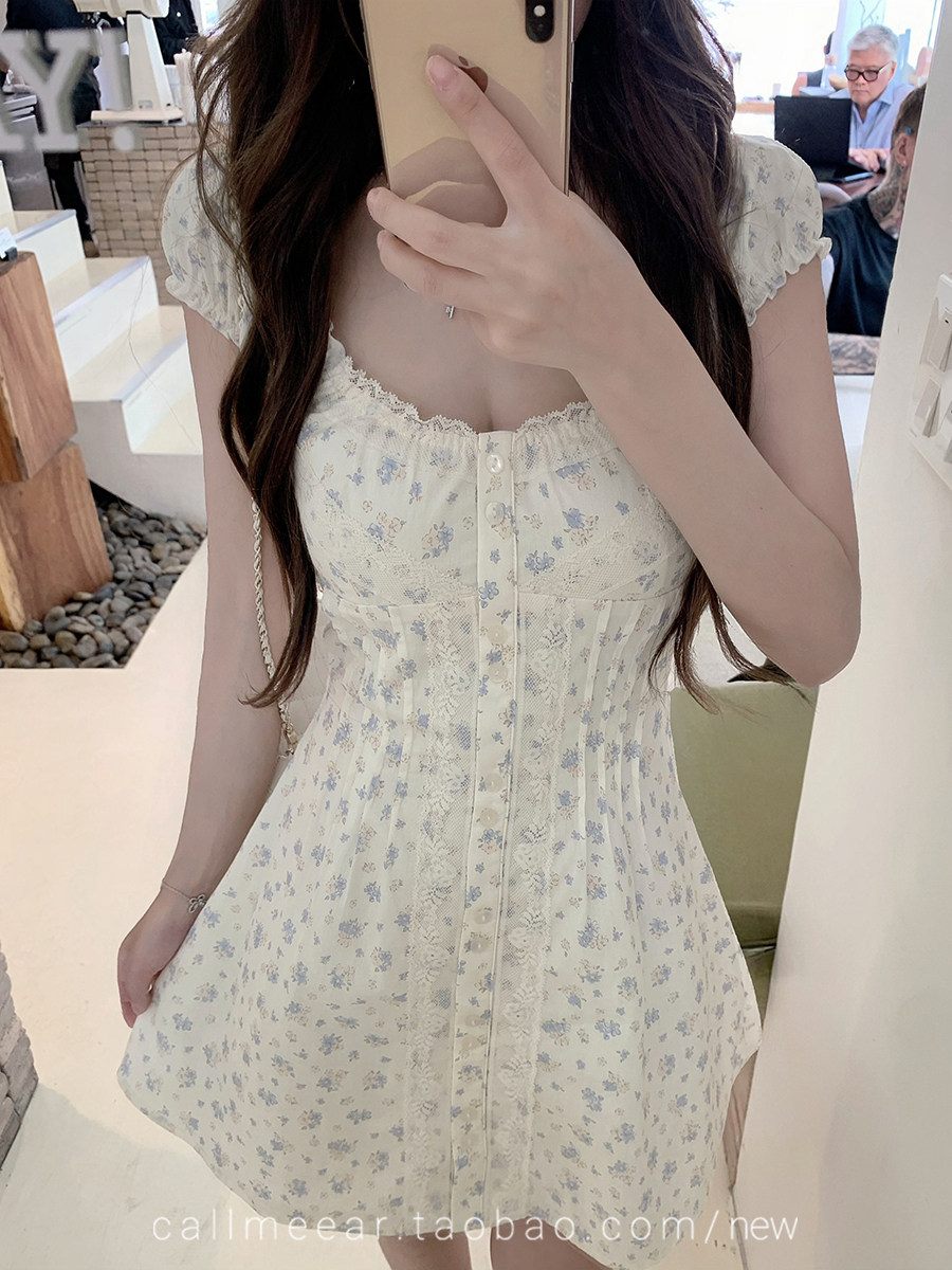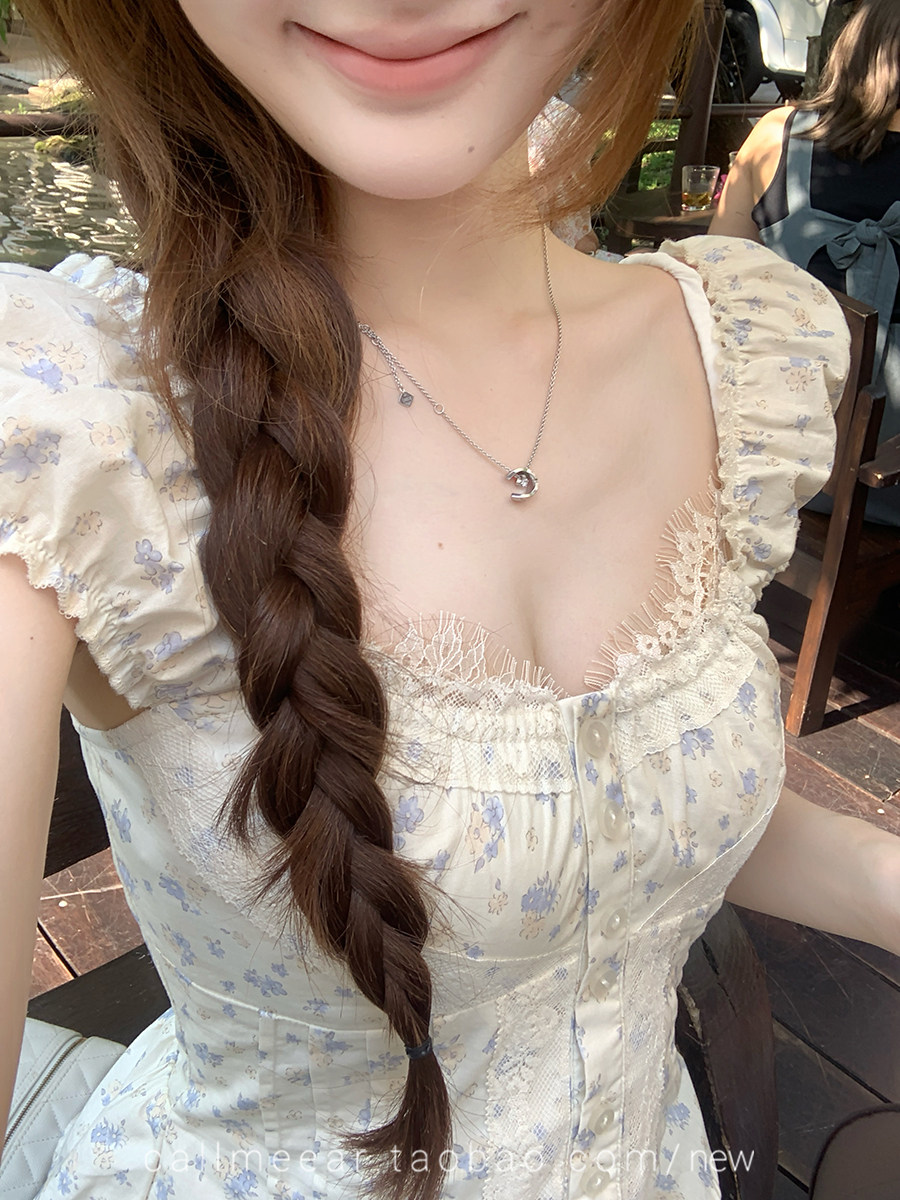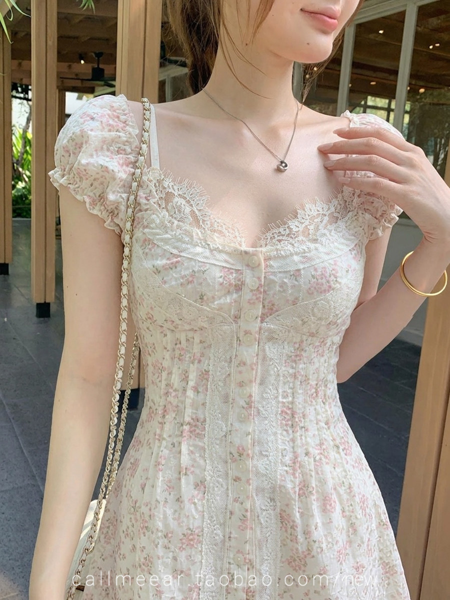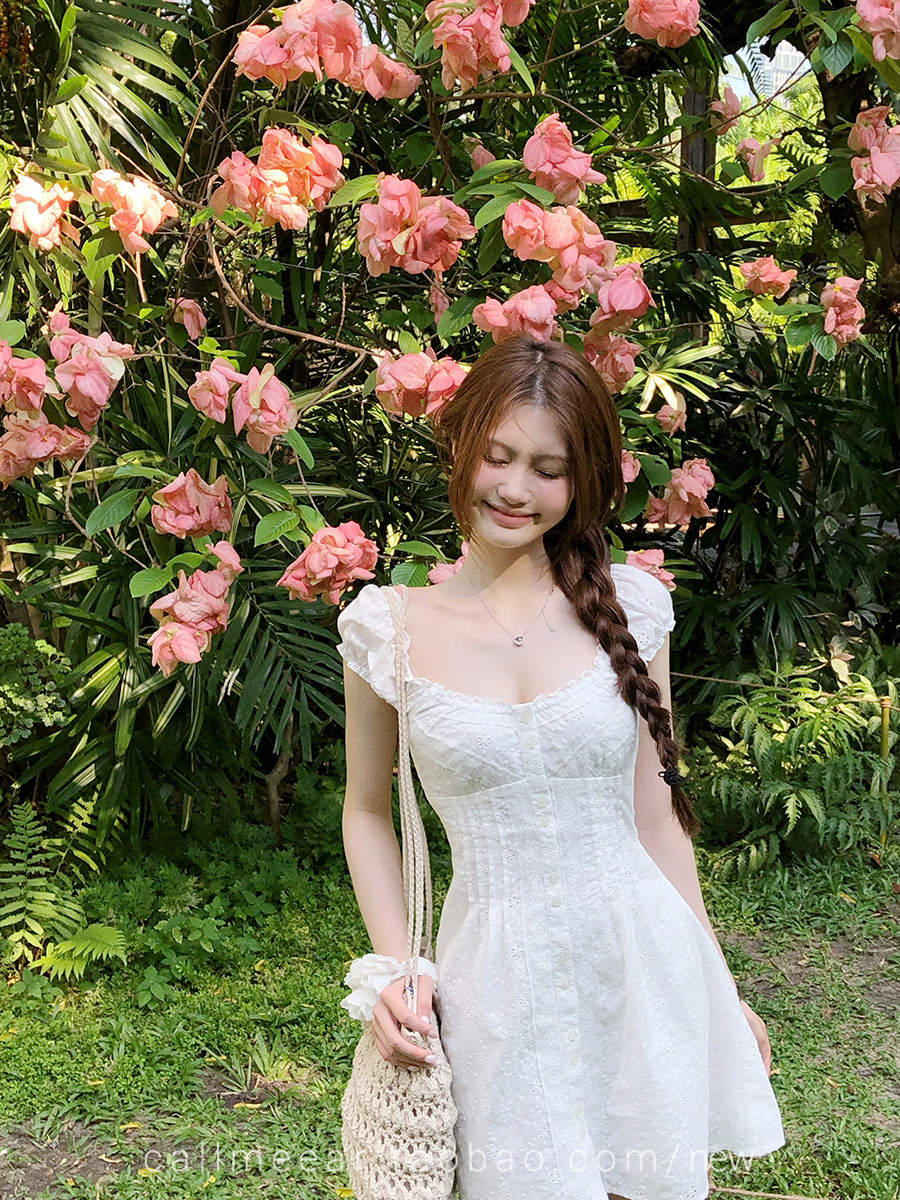 레이스 조각 허리 수축 드레스 자카드 프릴 맨위 여름