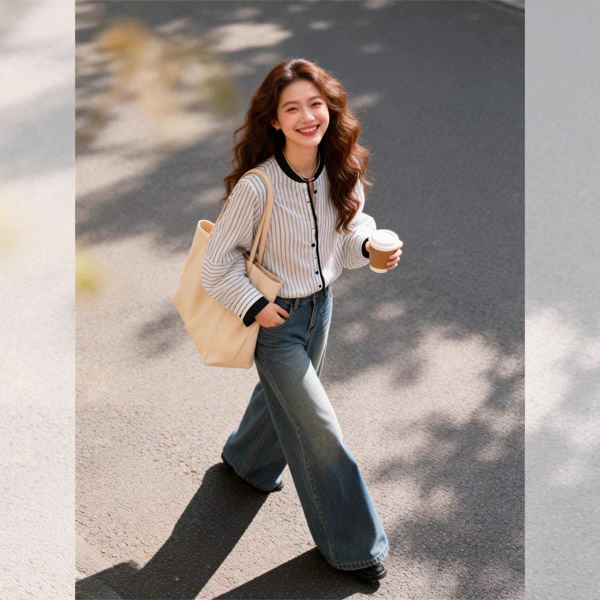 여름 드레스 새로운 빅 사이즈 스트라이프 셔츠 디자인 센스 작은 대중 맨위 남자 친구 바람 루즈핏 긴팔 셔츠 오픈 가디건