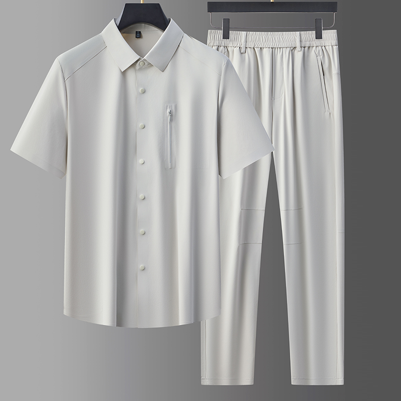 국경 간 아빠 로드 중 새로운 중식 국풍 세트 여름 얇은 스타일 남성 반팔 티셔츠 얼음 실크 없음 흔적 투피스 세트
