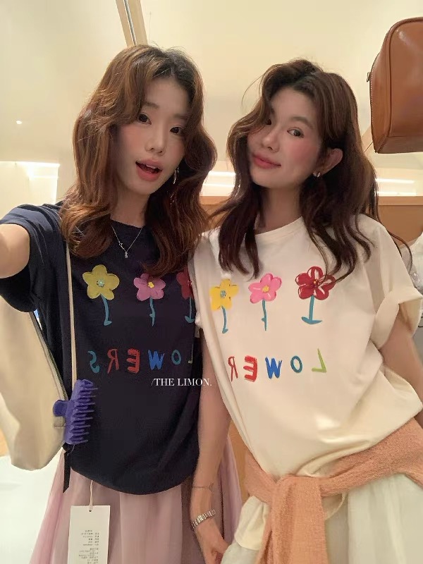 레몬 녹차 연령 감소 색상 프린트 3 차원 꽃 루즈핏 다용도 캐주얼 반팔 티셔츠 여성 여름 섹션