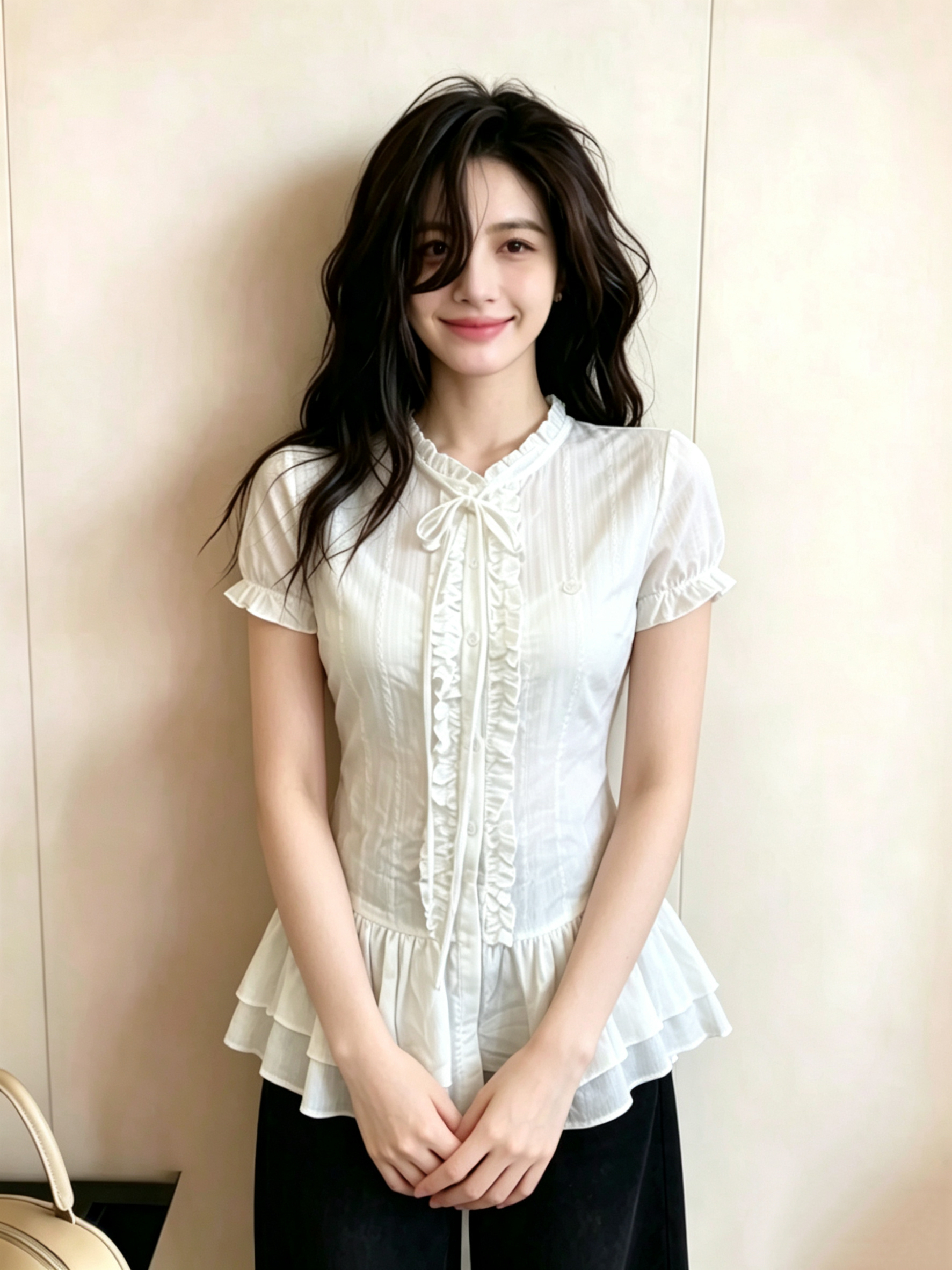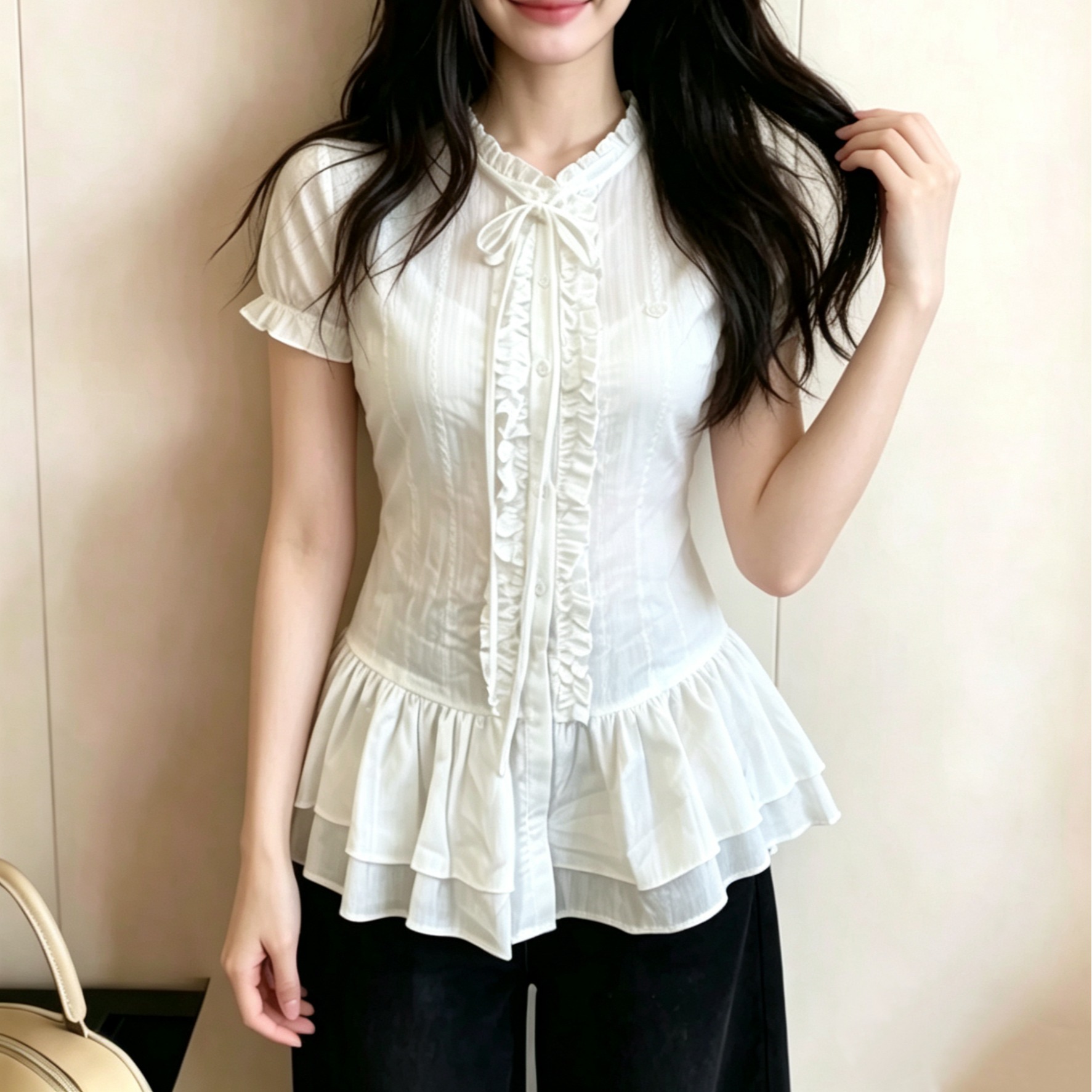 있음 선적 빅 사이즈 한 부서 달콤한 스타일 프릴 반팔 여성 셔츠 여름 중간 길이 허리 수축 슬림해 보이는 맨위