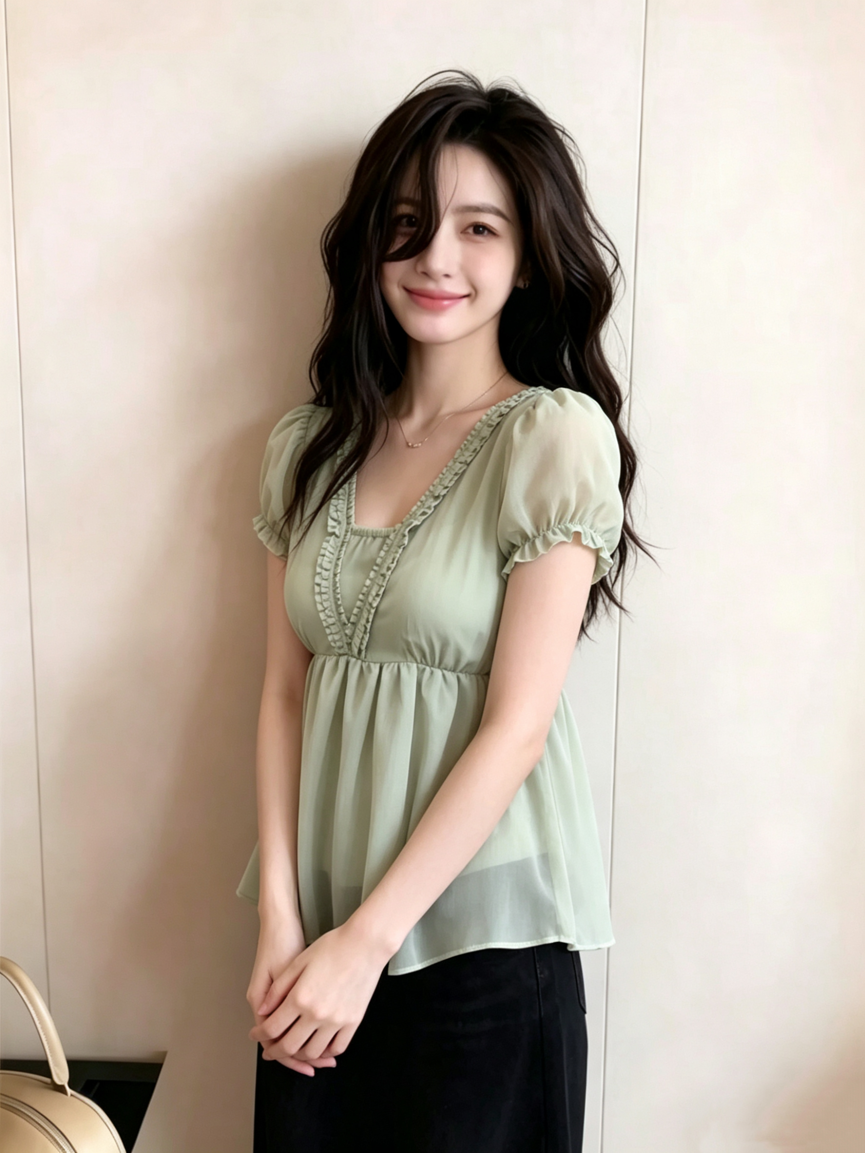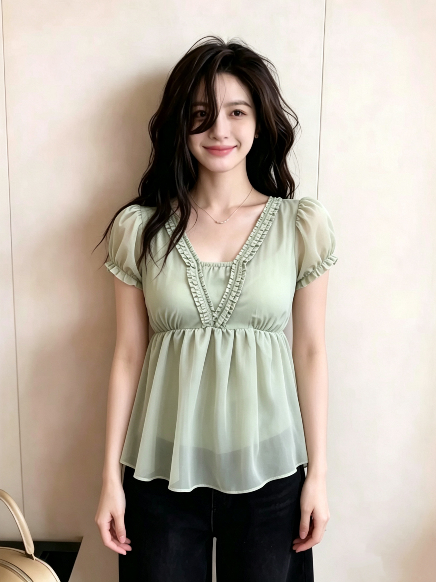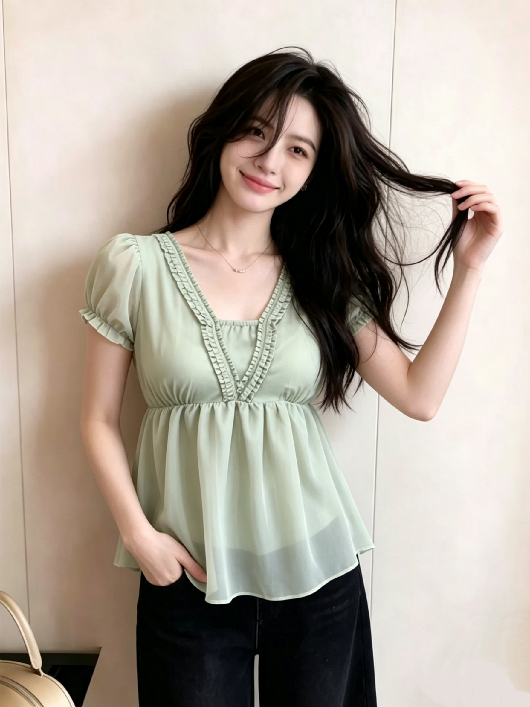 있음 선적 빅 사이즈 프랑스식 우아함 바람 반팔 V넥 쉬폰 여성 셔츠 얇고 가벼운 통기성 Chic 아름다운 맨위