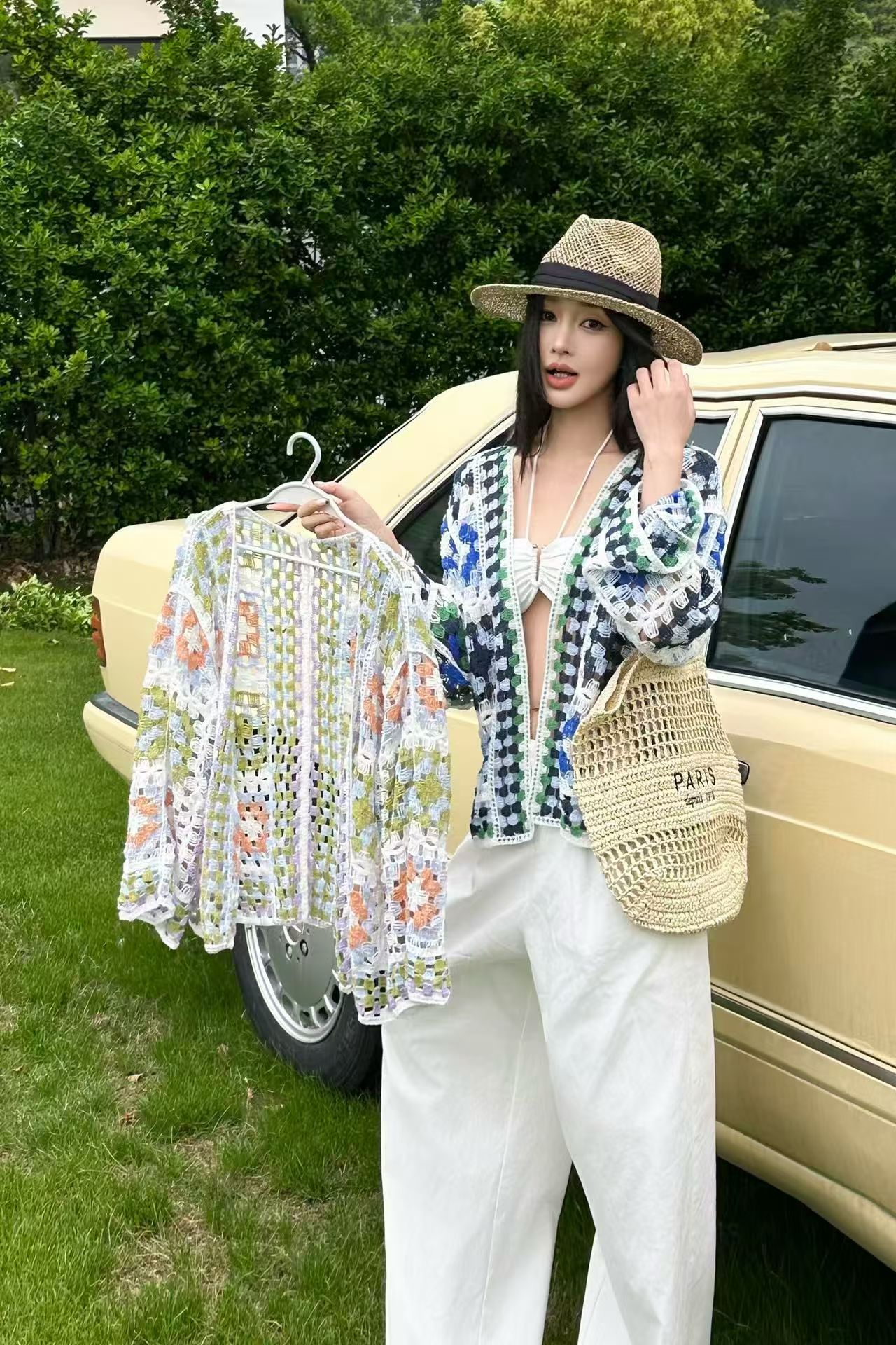 홀로우 아웃 훅 제직 꽃 살구 색상 니트 여성 코트 여름 새로운 작은 대중 디자인 품격 맨위