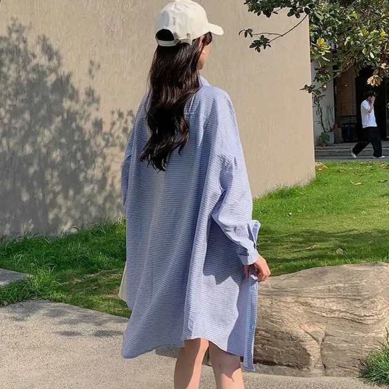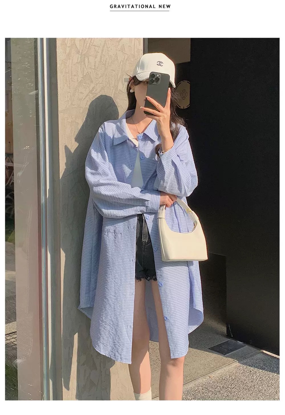 여름 드레스 새로운 느긋한 바람 질감 센스 에어컨 셔츠 중간 길이 폴로 칼라 긴팔 외부 가져 가라. 스트라이프 셔츠