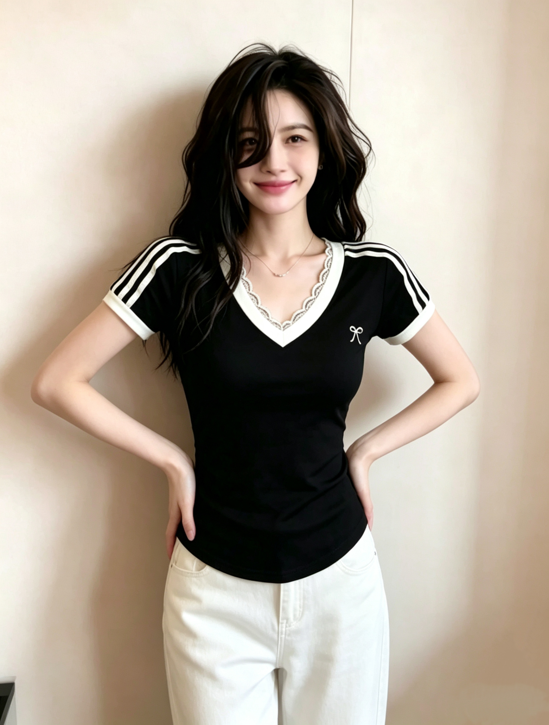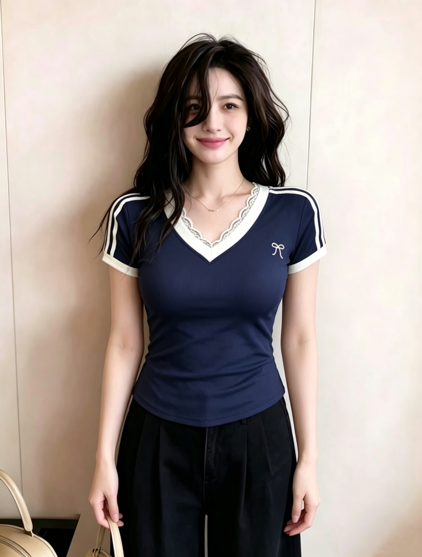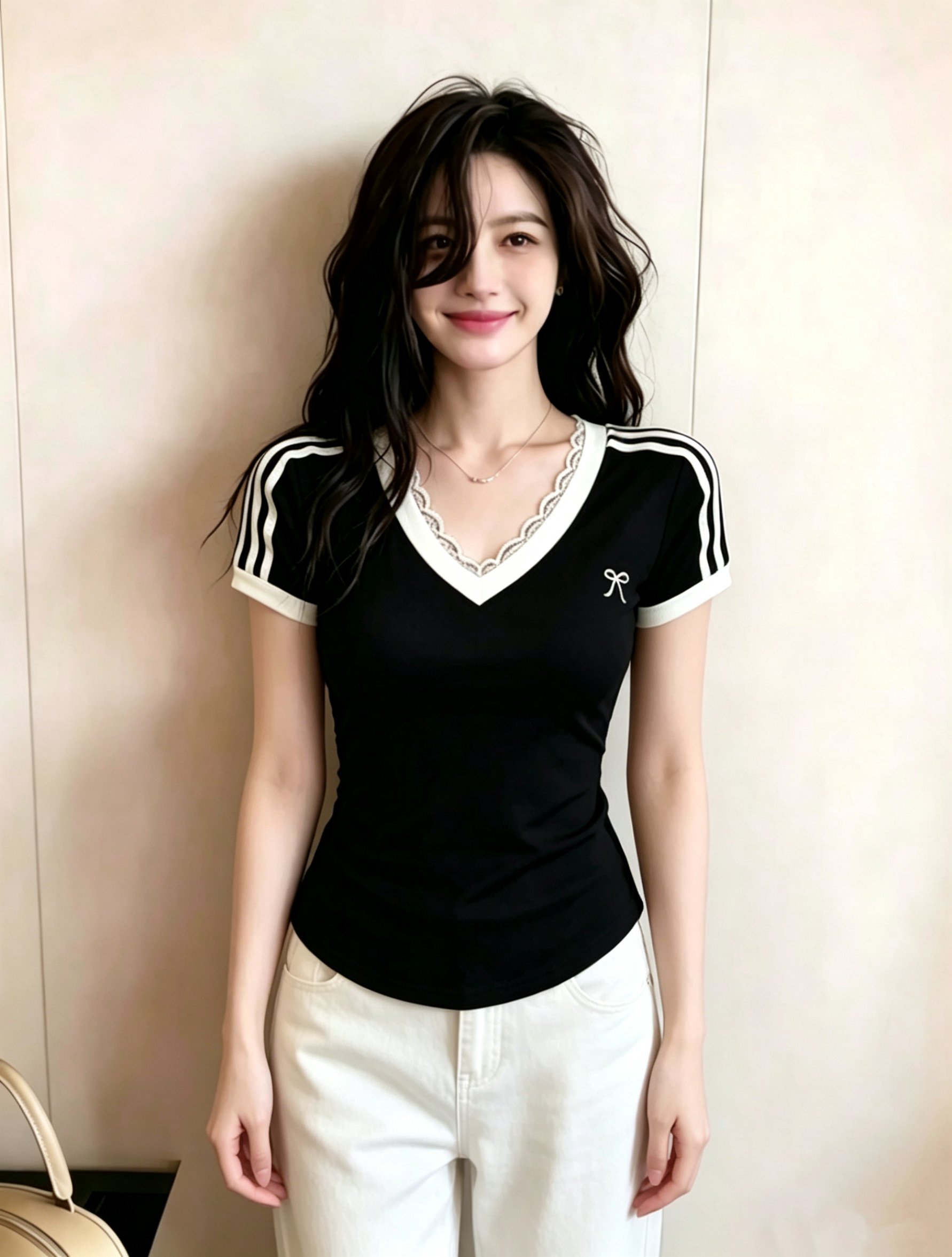 있음 선적 빅 사이즈 순수한 욕망 바람 V넥 반팔 티셔츠 여성 여름 디자인 센스 비틀림 슬림해 보이는 핫걸 맨위