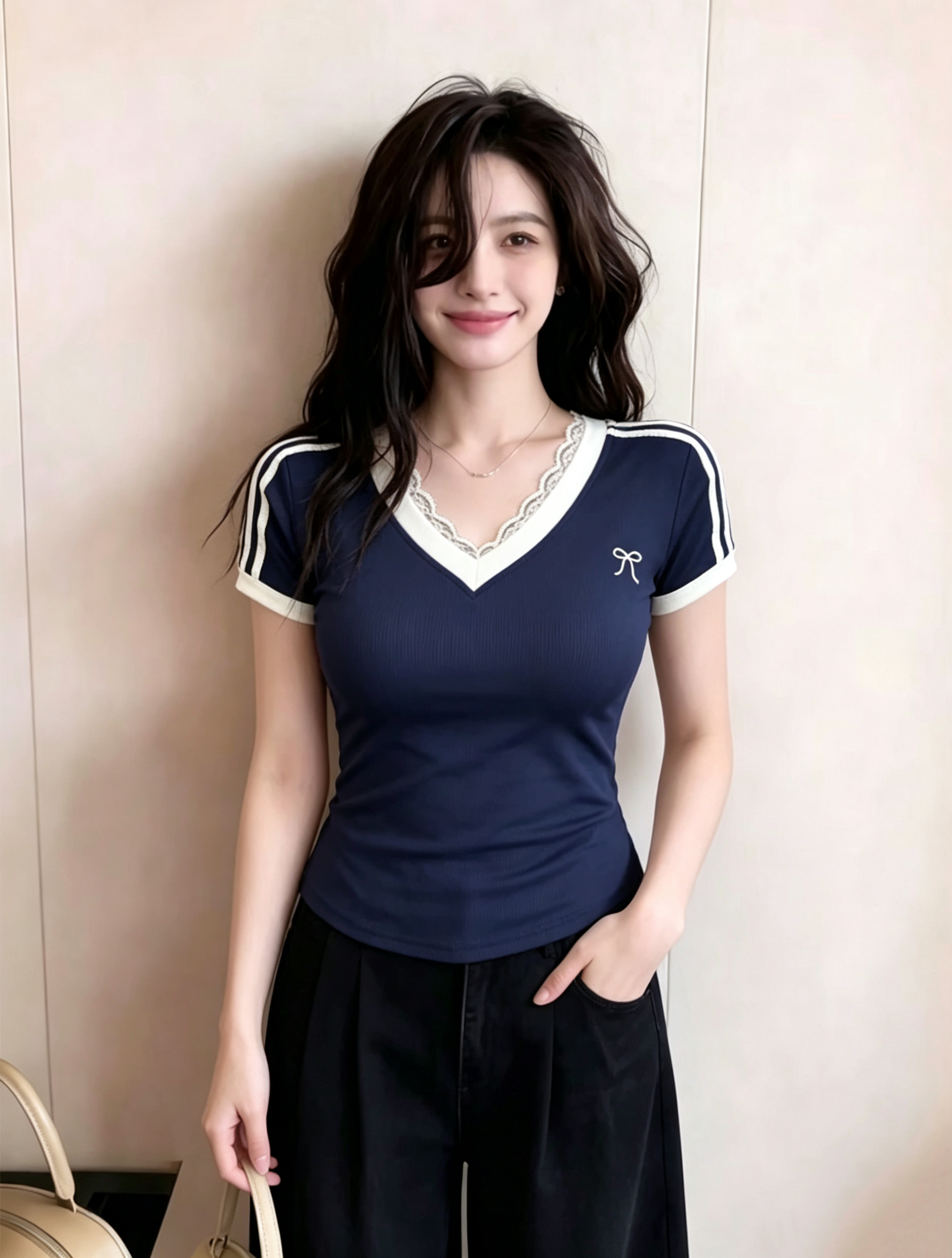 있음 선적 빅 사이즈 한 부서 달콤한 차가운 바람 레이스 조각 V넥 반팔 티셔츠 여성 디자인 센스 자수 슬림해 보이는 맨위