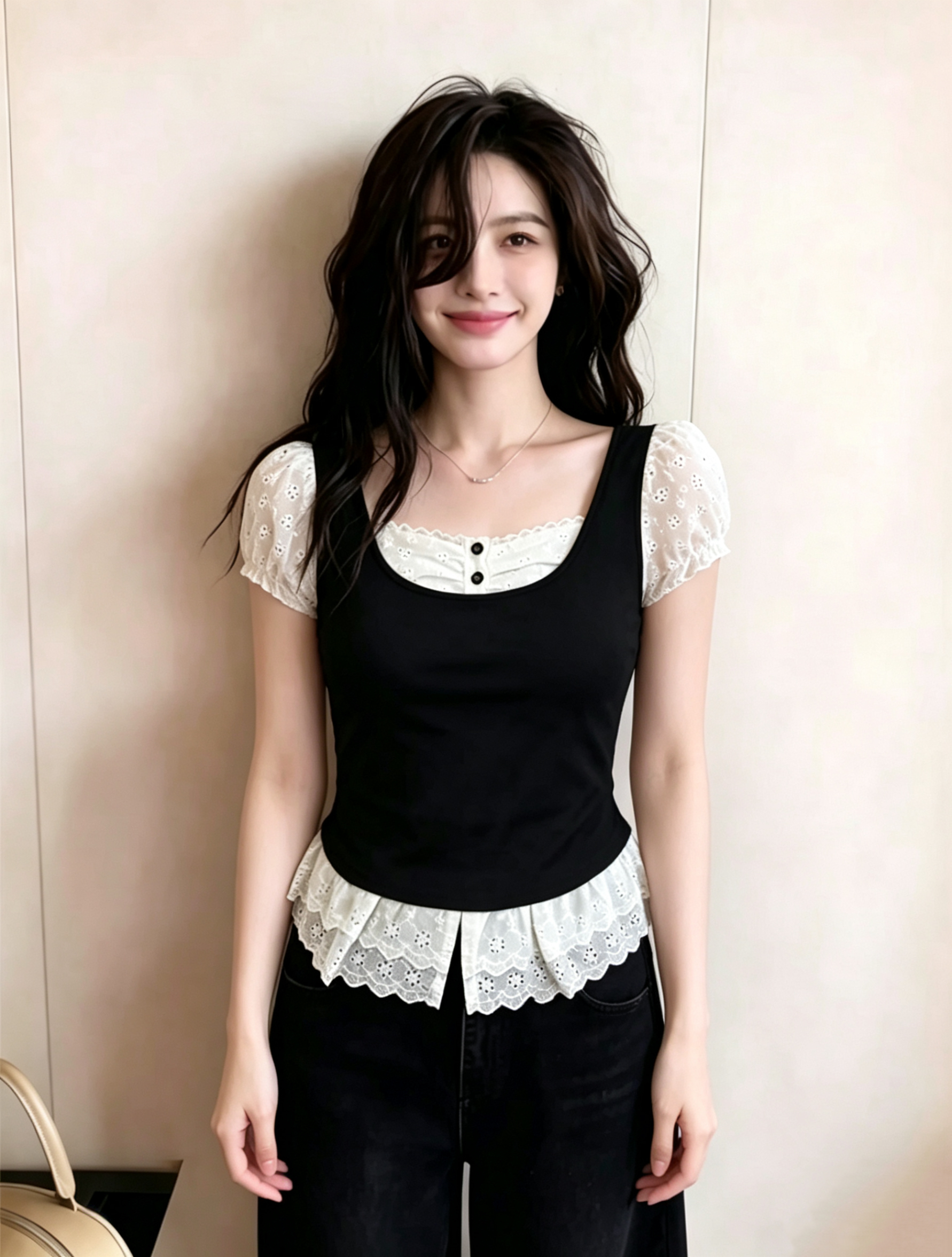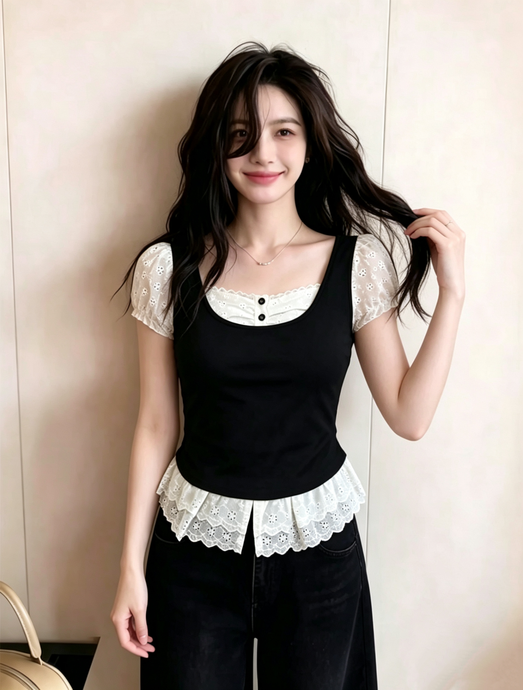 있음 선적 빅 사이즈 달콤한 매운맛 바람 페이크 레이어드 거품 소매 티셔츠 여성 여름 디자인 센스 밑단 레이스 슬림해 보이는 맨위