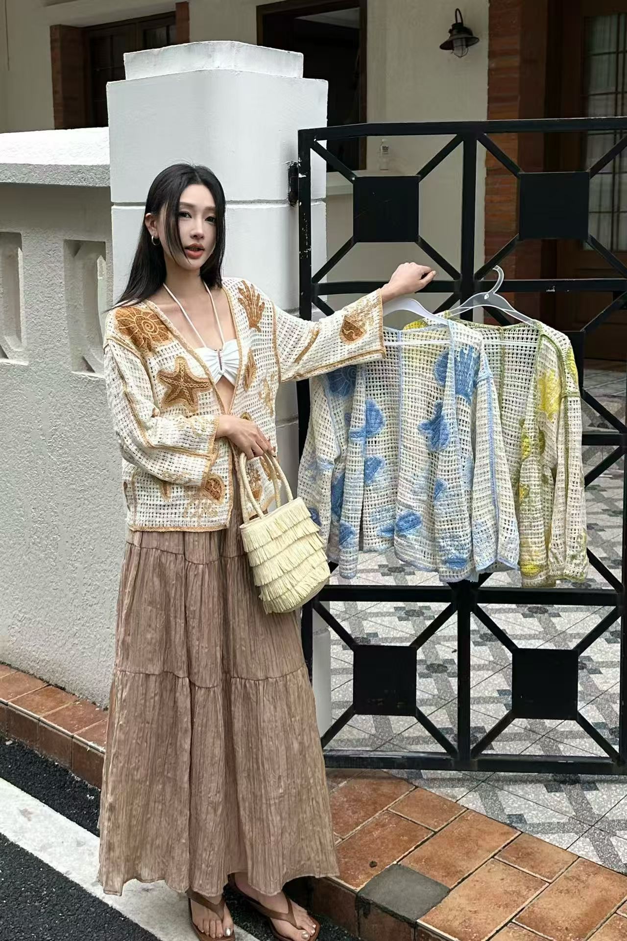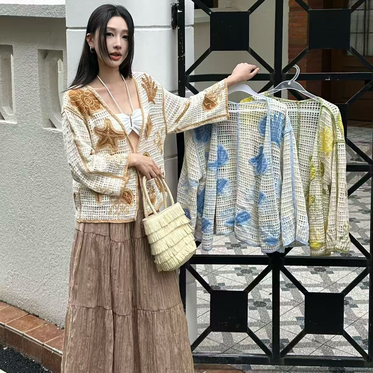 홀로우 아웃 훅 제직 꽃 살구 색상 니트 여성 코트 여름 새로운 작은 대중 디자인 품격 맨위