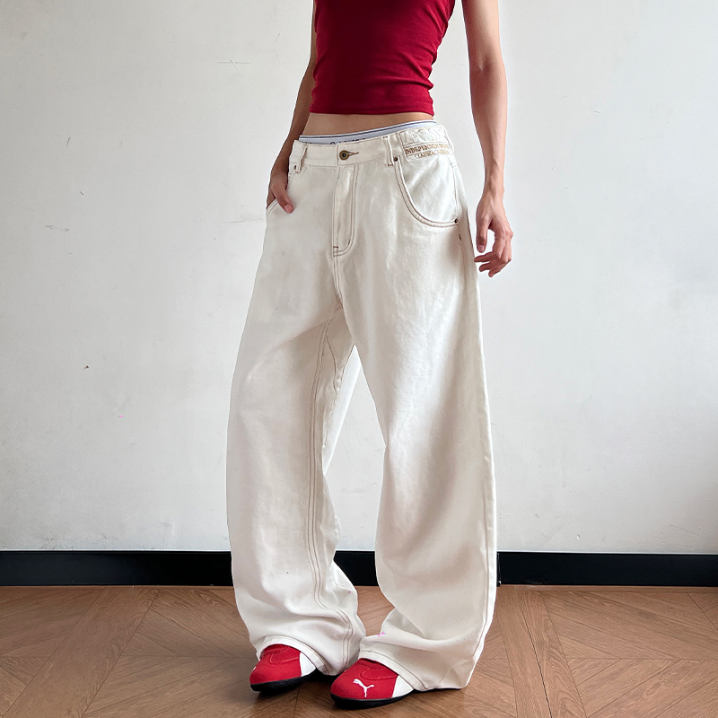 실사 2026 새로운 아메리칸 청바지 높음 거리 파리 버클 디자인 센스 다용도 조수 브랜드 마 오래된 넓은 다리 스트레이트 팬츠