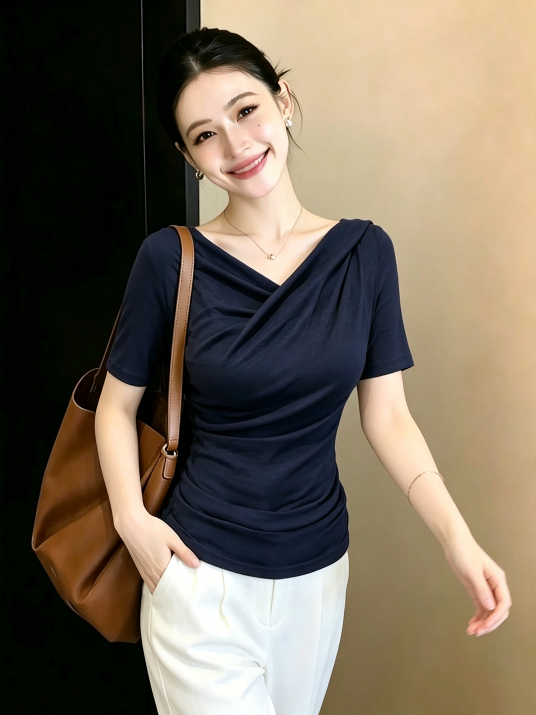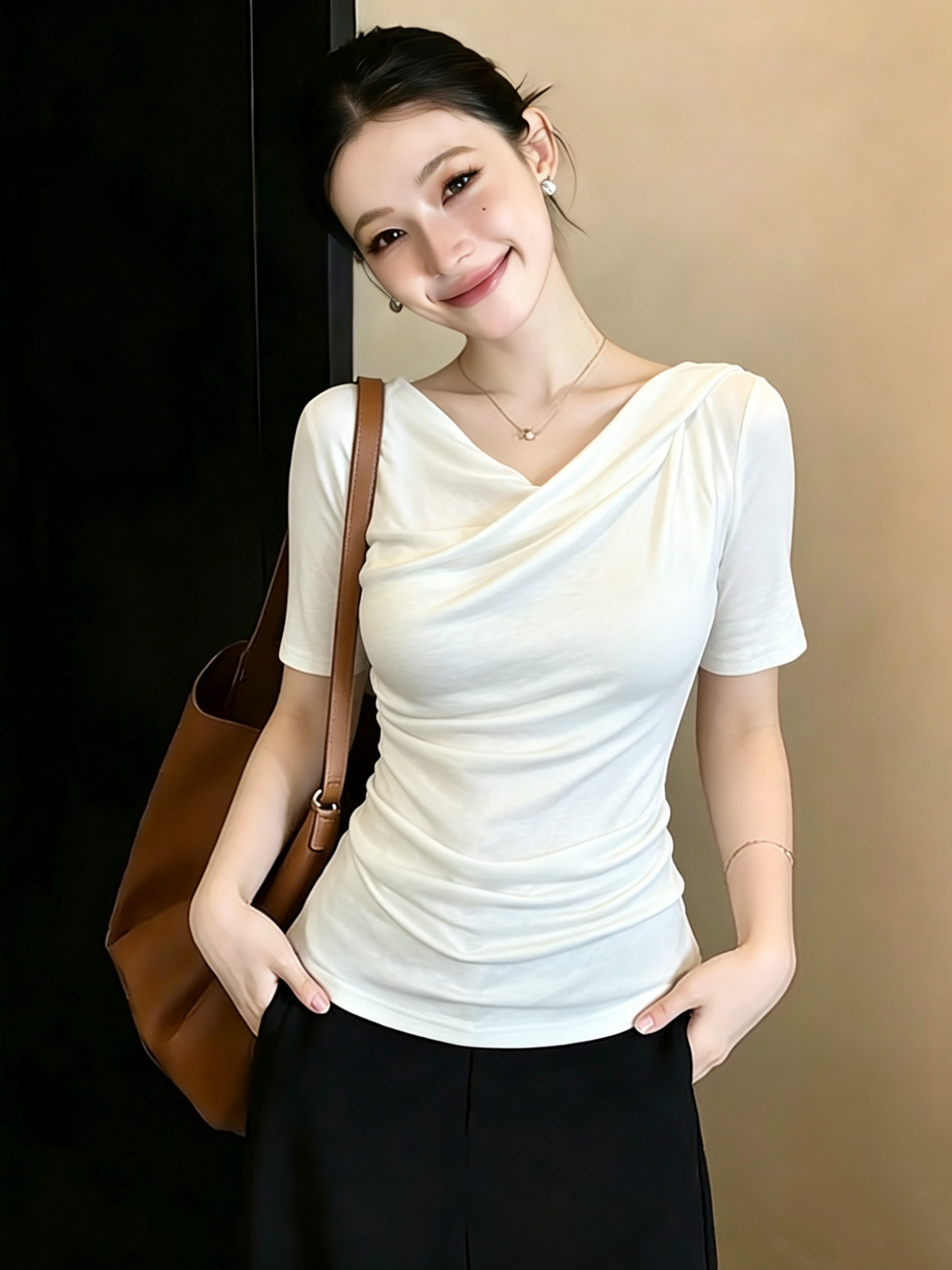 있음 선적 빅 사이즈 순수한 욕망 바람 V넥 반팔 티셔츠 여성 여름 디자인 센스 비틀림 슬림해 보이는 핫걸 맨위