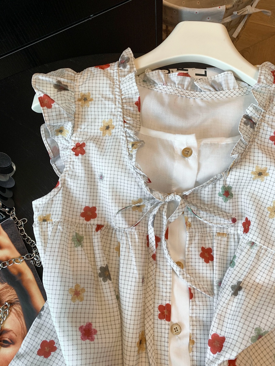 한 부서 프릴 레이스업 체크무늬 여성 셔츠 여름 연령 감소 루즈핏 민소매 인형 셔츠 디자인 센스 페이크 레이어드 맨위