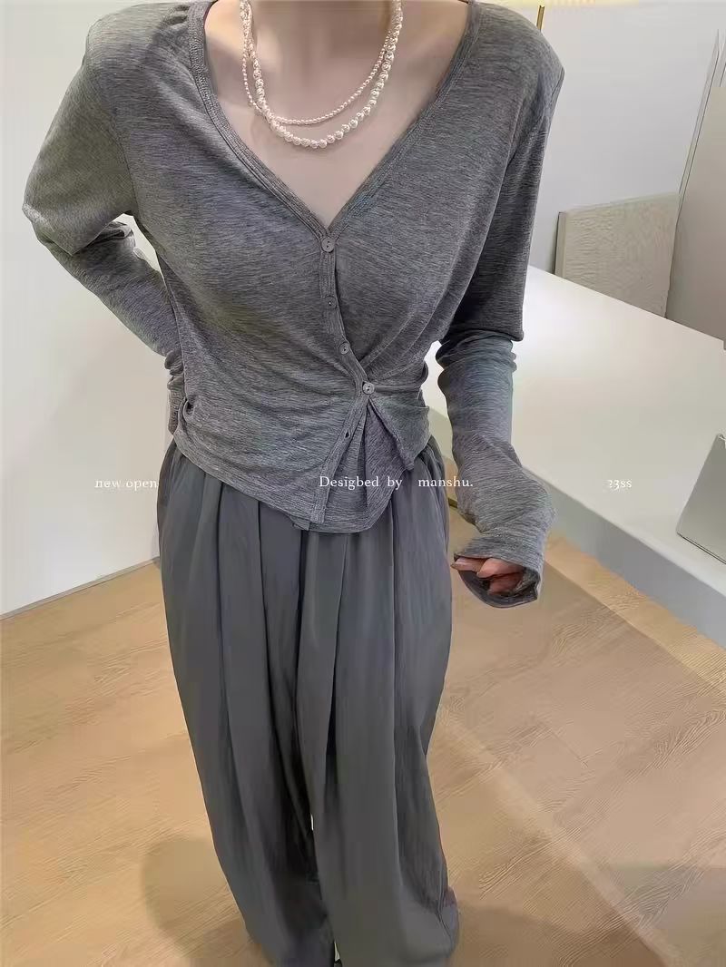 불규칙 긴팔 얼음 실크 가면 티셔츠 여성 여름 유럽 역 2026 새로운 패션 V넥 디자인 센스 자외선 차단 맨위
