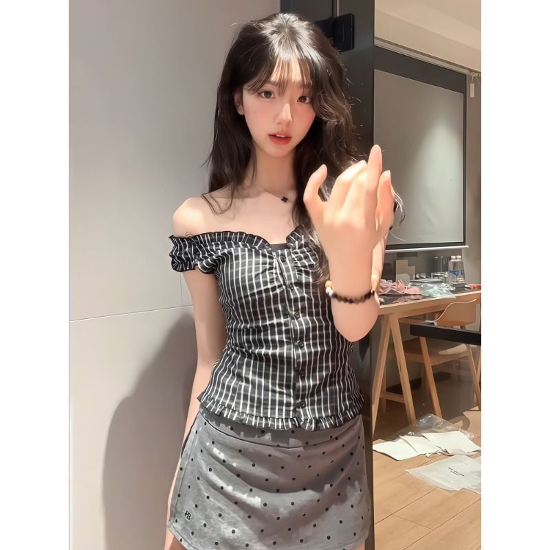 아름다운 오프숄더 체크무늬 여성 셔츠 여름 새로운 둘 착용 오프숄더 셔츠 섹시함 맨위
