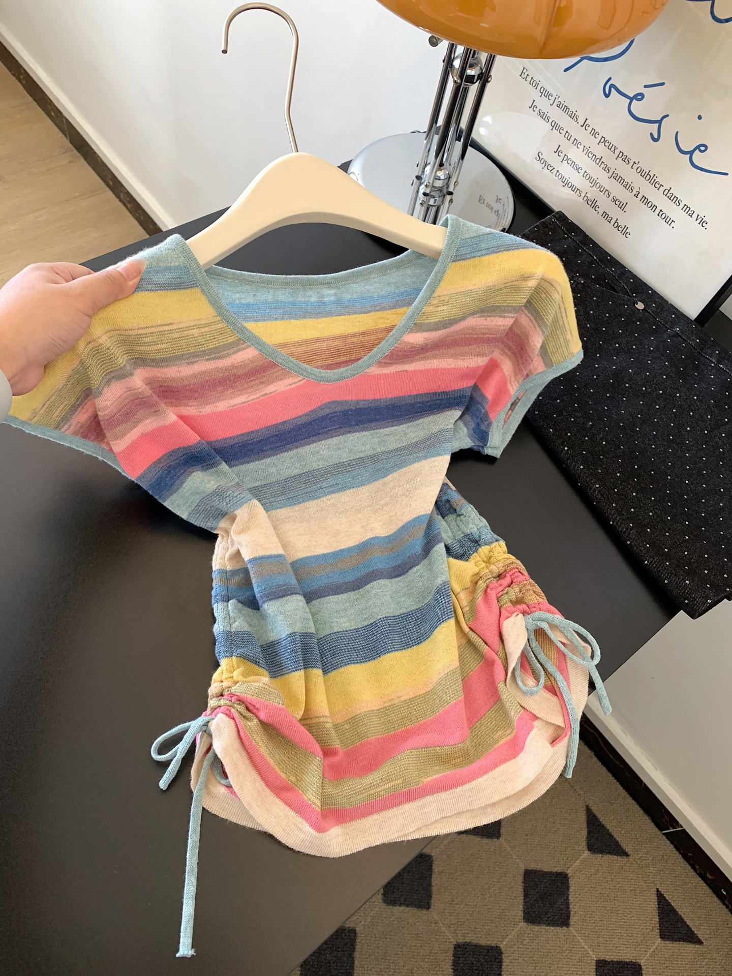 파란색 V넥 색상 스트라이프 루즈핏 슬림해 보이는 반팔 티셔츠 여성 인사이드 가져 가라. 수 있습니다. 외출용 쇼트 스타일 긍정적 인 어깨 작은 맨위 2026 여름