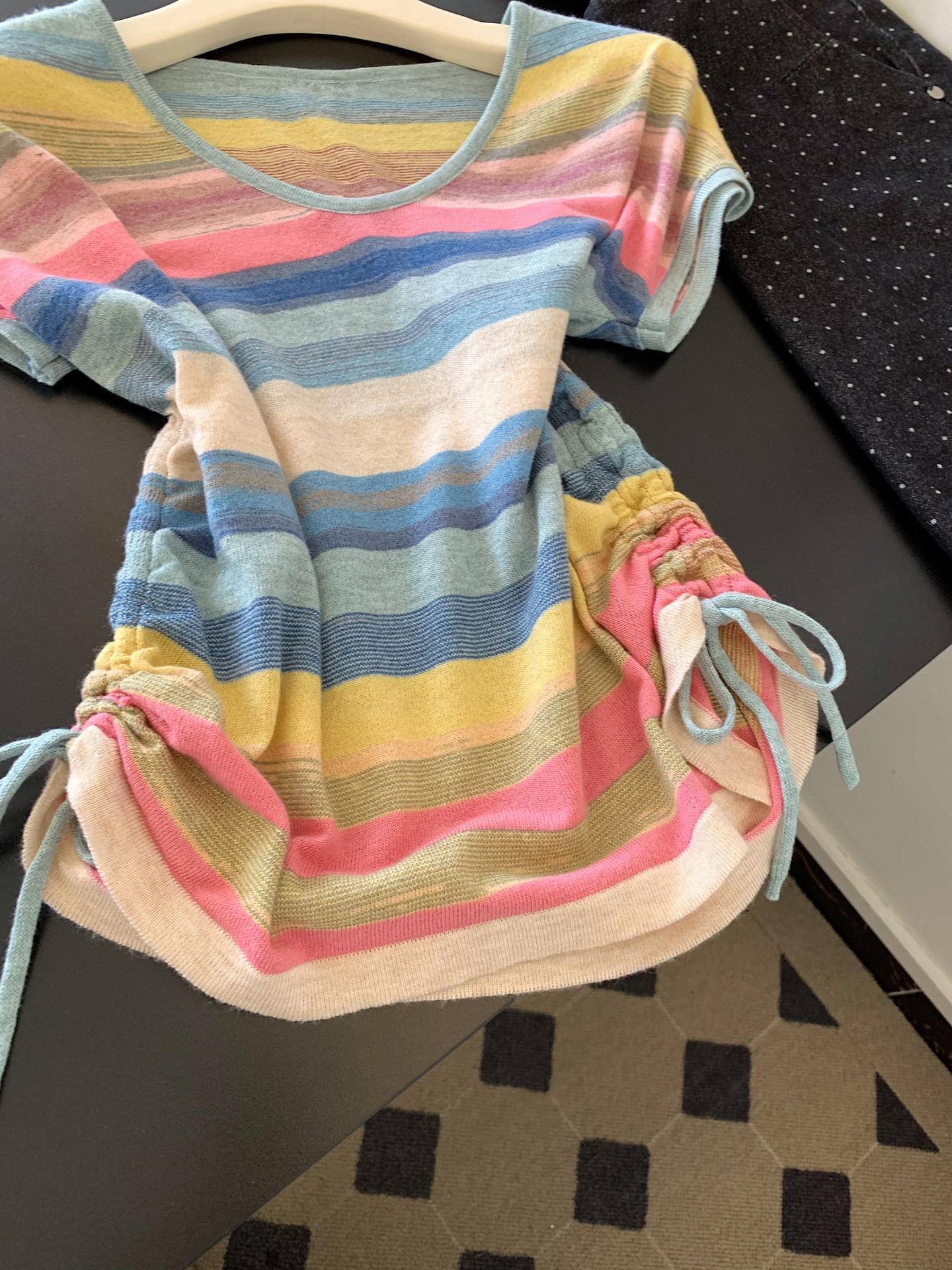 파란색 라운드 넥 색상 스트라이프 루즈핏 반팔 티셔츠 여성 인사이드 가져 가라. 수 있습니다. 외출용 쇼트 스타일 긍정적 인 어깨 작은 맨위 2026 여름