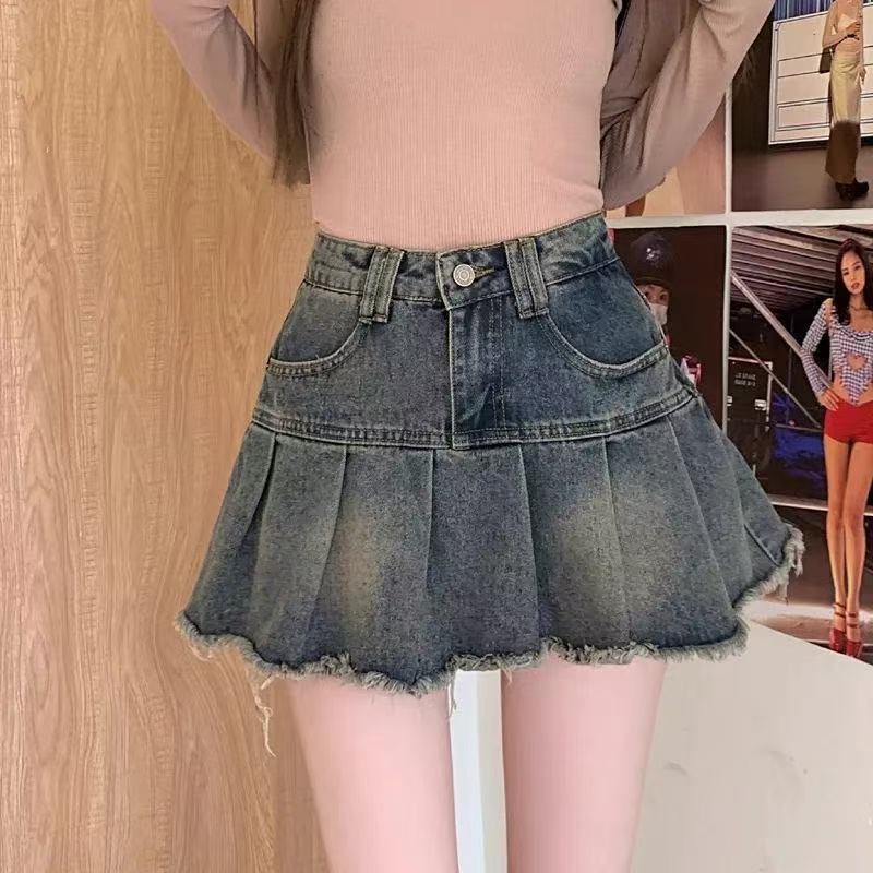 여름 데님 반신 치마 2026 년 새로운 치마바지 A라인 스커트 하이웨이스트 플리츠 퍼프 스커트 중간 길이 스커트 우산 치마