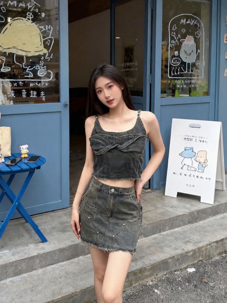레트로 아메리칸 바람 데님 슬립 쇼트 스타일 맨위 2026 여름 새로운 차가운 매운맛 품격 몸매 가꾸기 여성 패션 세트