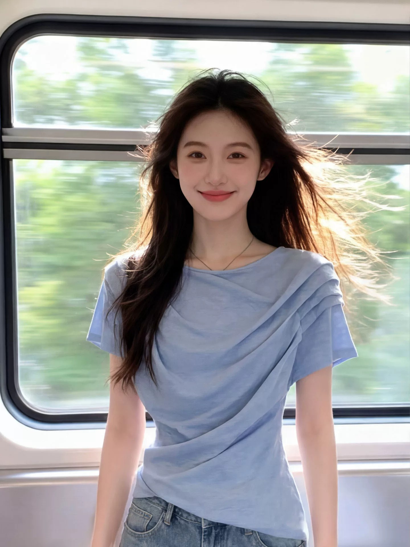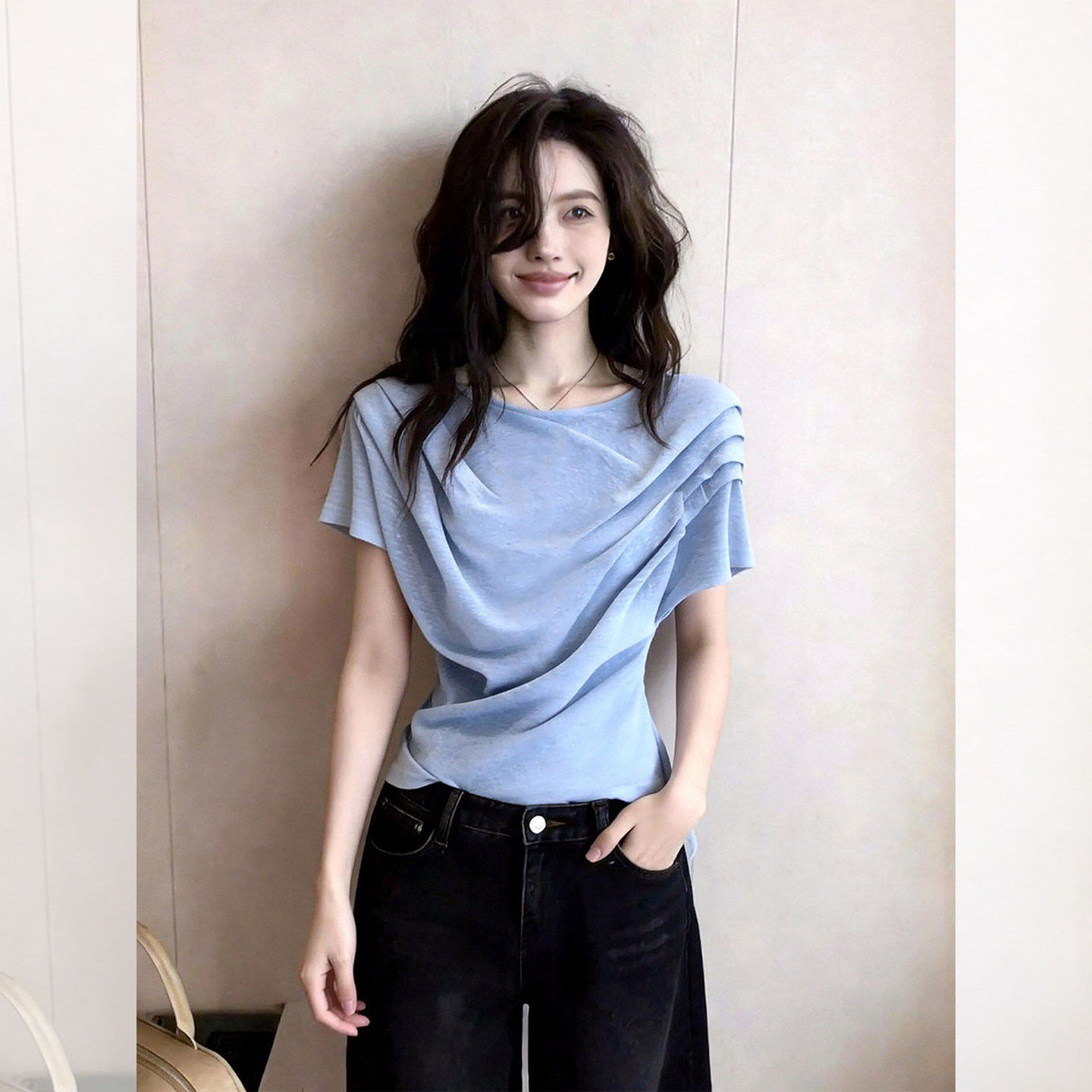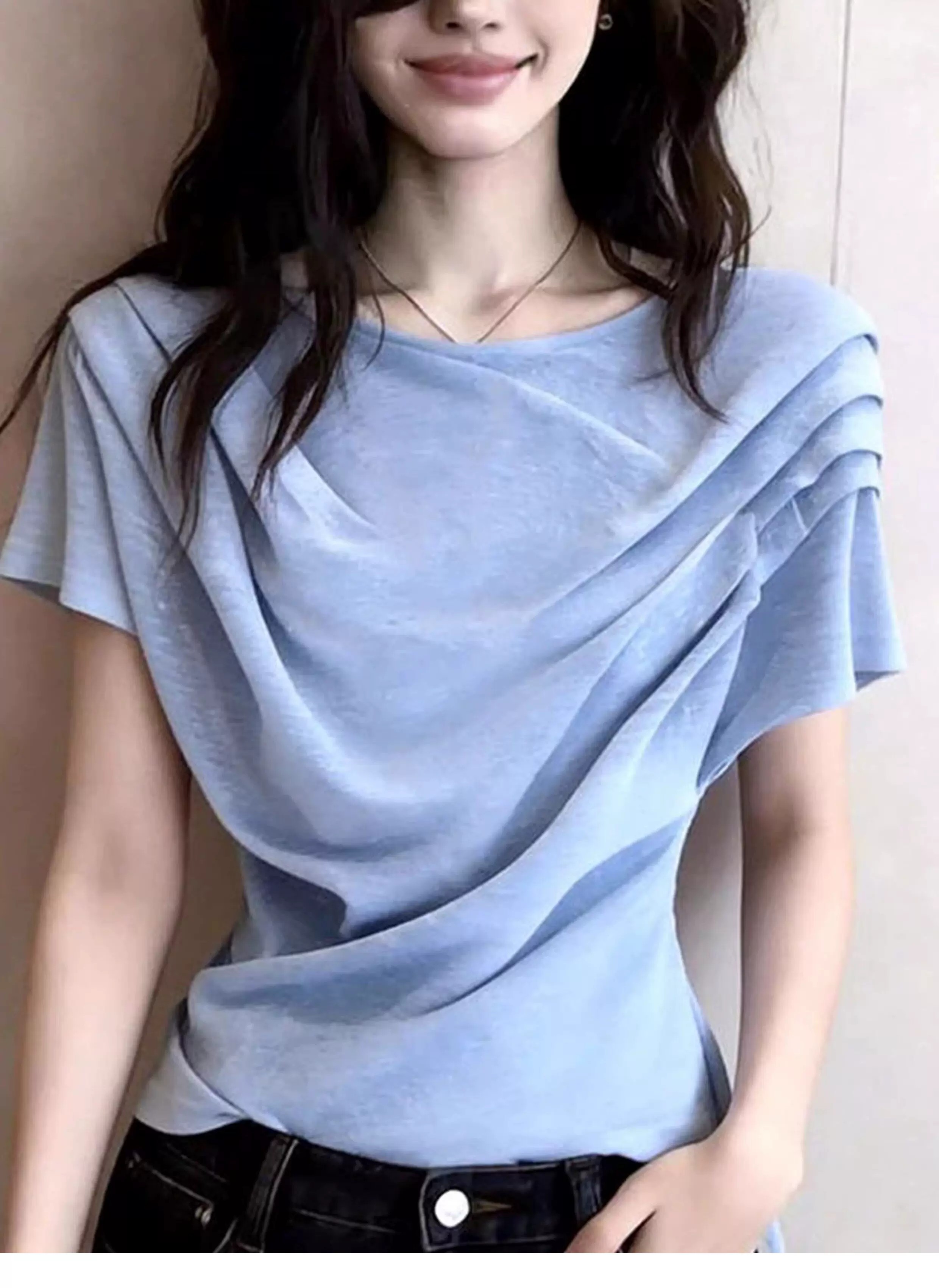 파란색 주름 반팔 티셔츠 여성 2026 여름 슈퍼 화재 연령 감소 고유 한 아름다운 아니요 명중 섹션 그레이트 봐 의류
